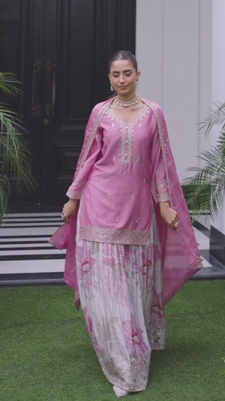This Rose Pink Skirt Set brings a playful charm with its premium silk kurta adorned in rose pink sequins, beads, cut dana, and golden thread work. Paired with a champagne floral printed skirt and matching dupatta, it’s perfect for adding a splash of elegance and fun to your festive wardrobe.