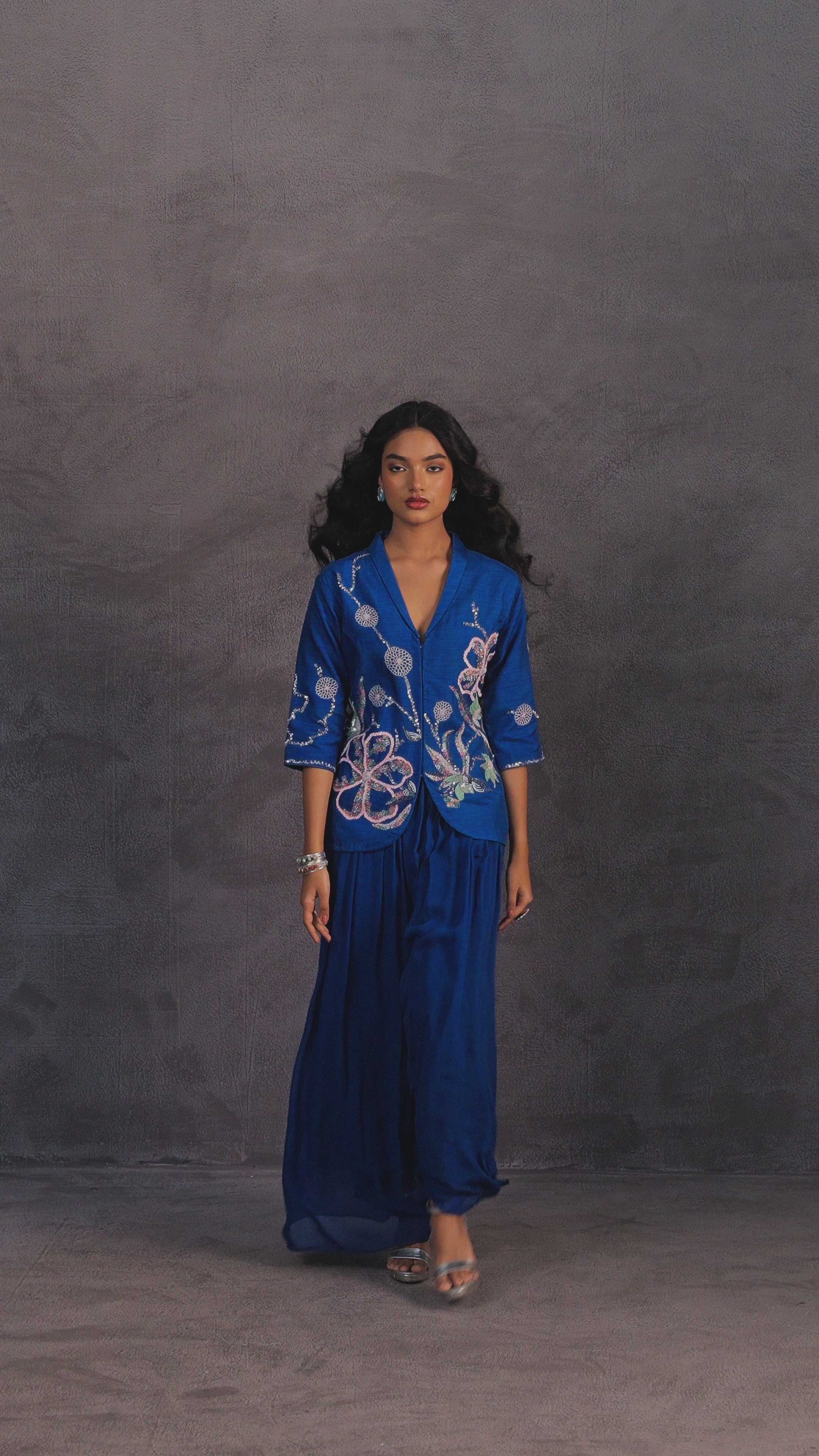 This striking Co-Ord set features a vibrant bright blue hue that effortlessly blends elegance and vibrancy. The jacket is crafted from luxurious raw silk and adorned with exquisite hand embroidery including sequins, beads, cut dana, and delicate thread work. Intricate floral and botanical motifs elevate the overall aesthetic. The tailored jacket is designed with a structured collar and pairs beautifully with a flowing georgette palazzo that adds grace and movement to the silhouette. Perfect for festive occasions this ensemble embodies refined craftsmanship and modern femininity.