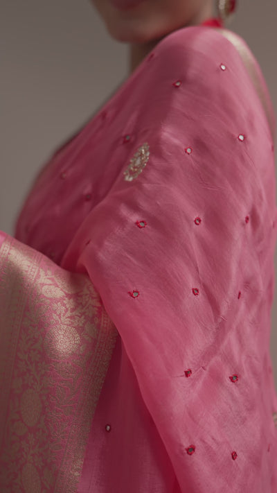 Embrace classic elegance with our Rose Rani Dola Silk Saree, woven from luxurious silk and featuring dazzling golden zari along the border and pallu. Delight in the delicate buta embroidery sprinkled throughout, adding a touch of whimsy.