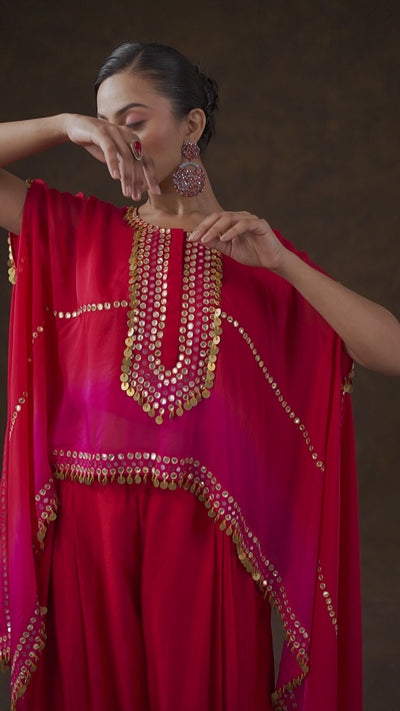 Make a truly unforgettable entrance in this glamorous Rose Red Ombré Palazzo Set. This three-piece ensemble features a flowing raw silk inner and pleated palazzo pants. The statement piece is the organza silk cape, which showcases a dramatic ombré effect and is richly detailed with intricate mirror work, decorative coins, and shimmering gota along the neckline and hem.