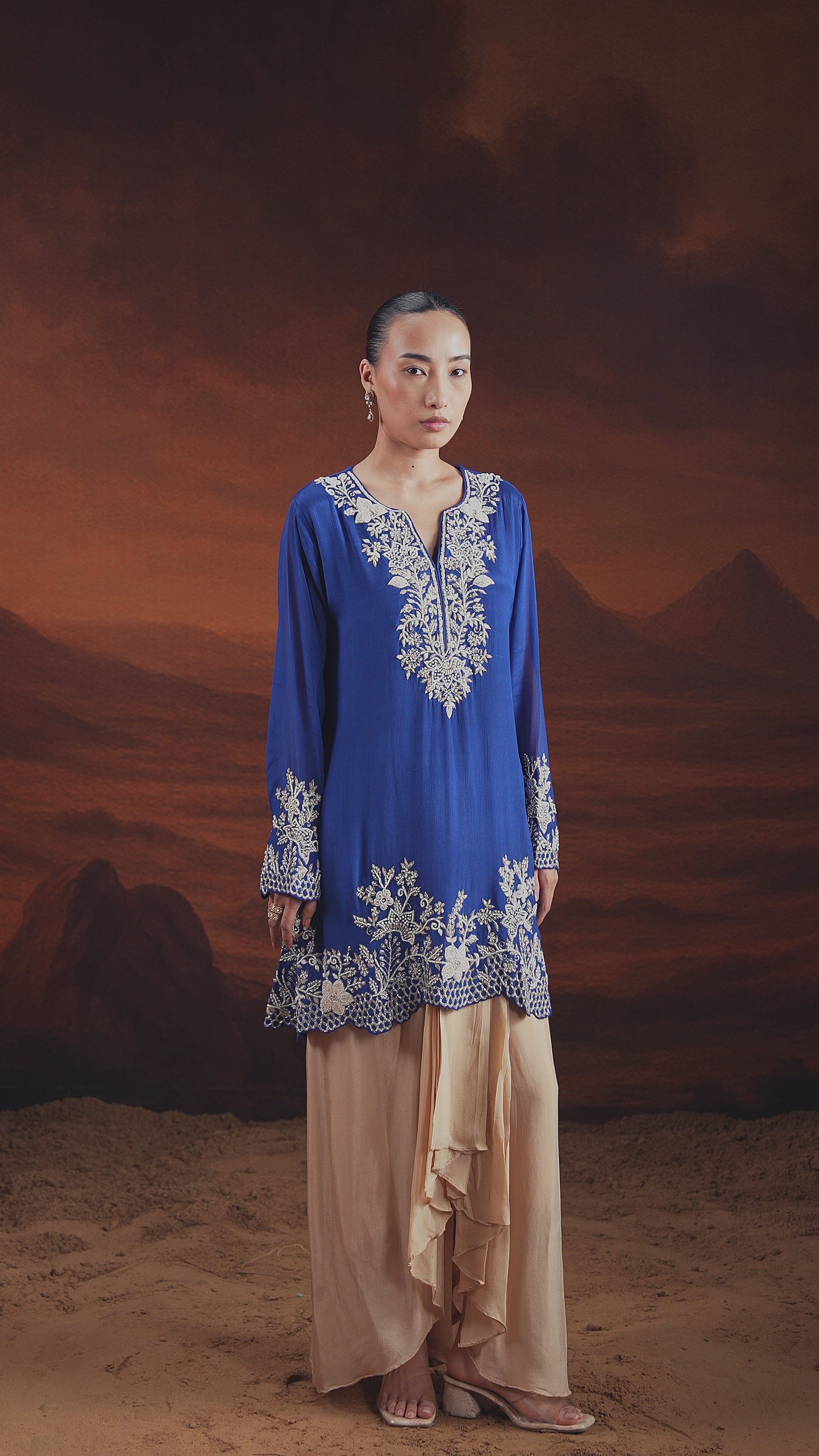 Make a statement in this striking Royal Blue & Beige Set. Crafted from flowing chinon silk, the vibrant kurta features an elegantly scalloped hem and is beautifully adorned with intricate cut dana, sequin, bead, zari, and thread handwork. It is perfectly complemented by a soft, draped skirt, creating a sophisticated and eye-catching ensemble.