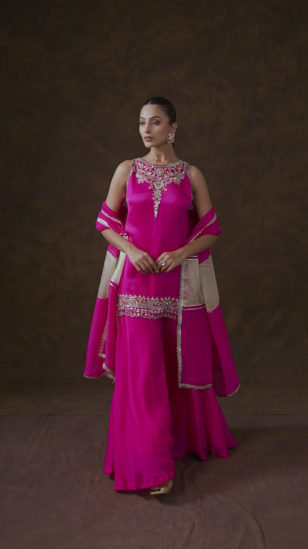 This is a 3-piece Kurta-Palazzo Set in vibrant Rani Pink.