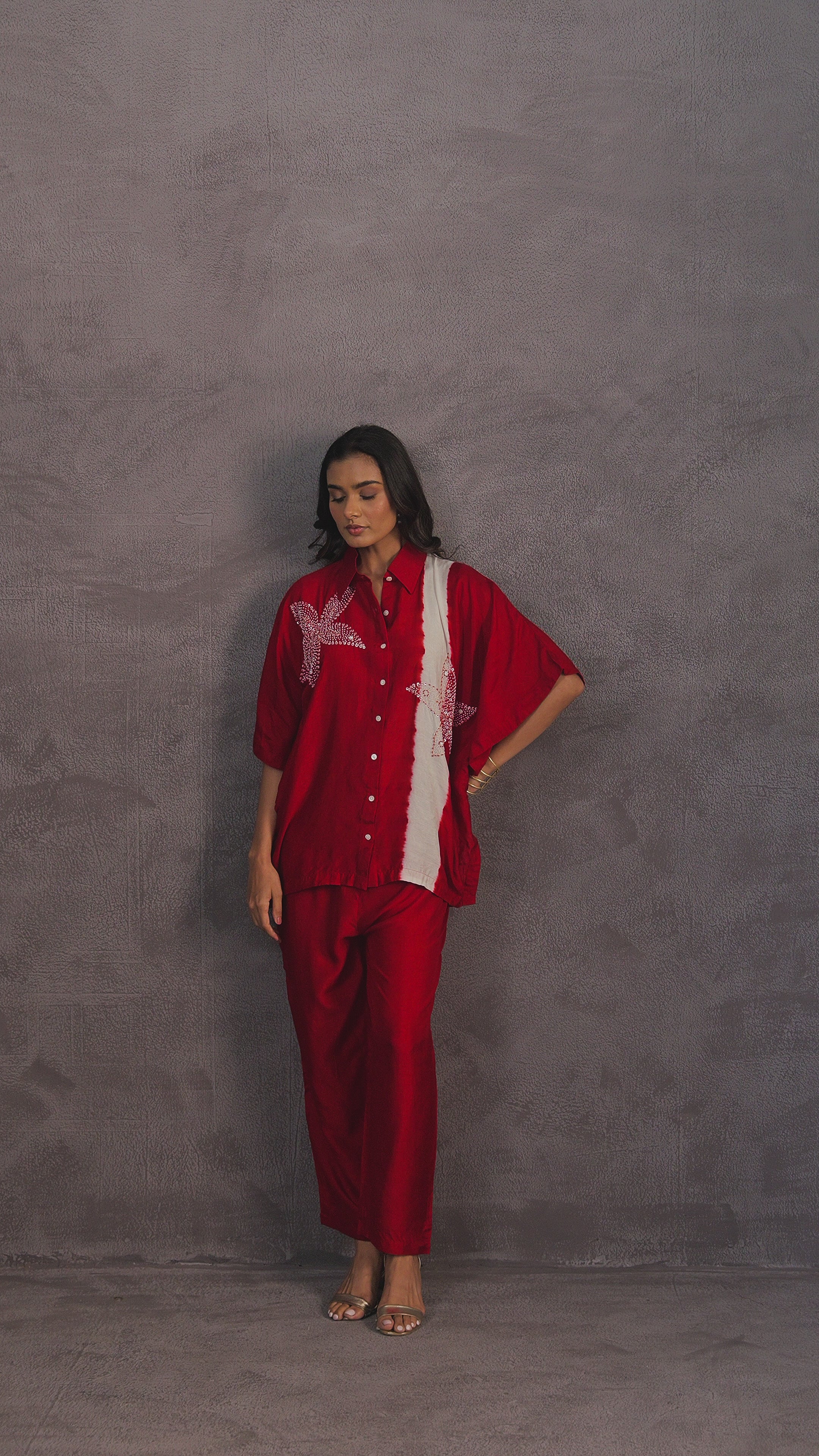 This vibrant Co-Ord set features a red tie-dye design crafted in luxurious raw silk.