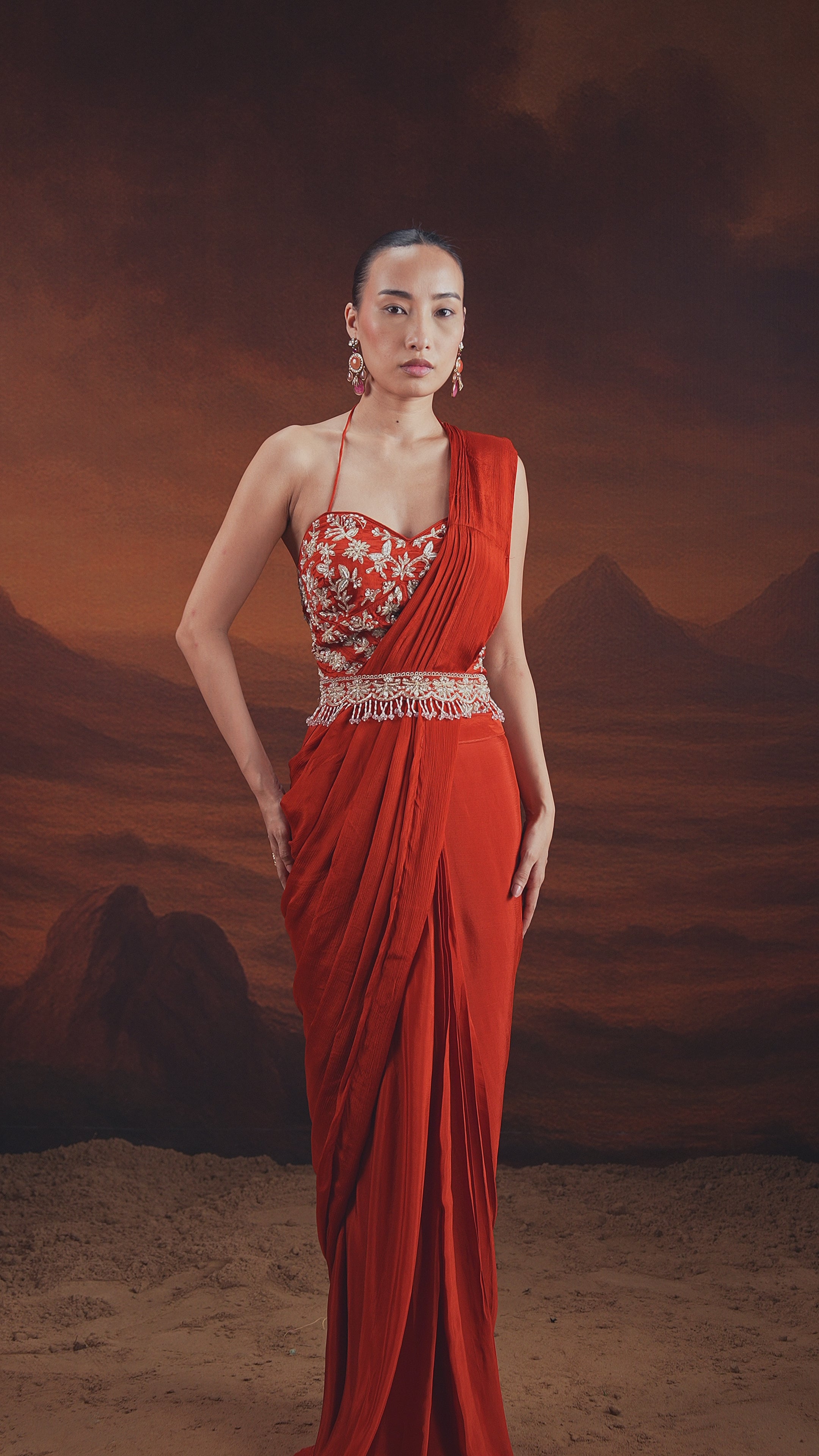 Turn heads in this striking Rust Orange Draped Saree Ensemble. Crafted from luxurious Chinon silk, this three-piece set features a beautifully embellished blouse, a pre-draped saree for effortless elegance, and a stunning beaded belt that cinches the waist for a perfect fit.