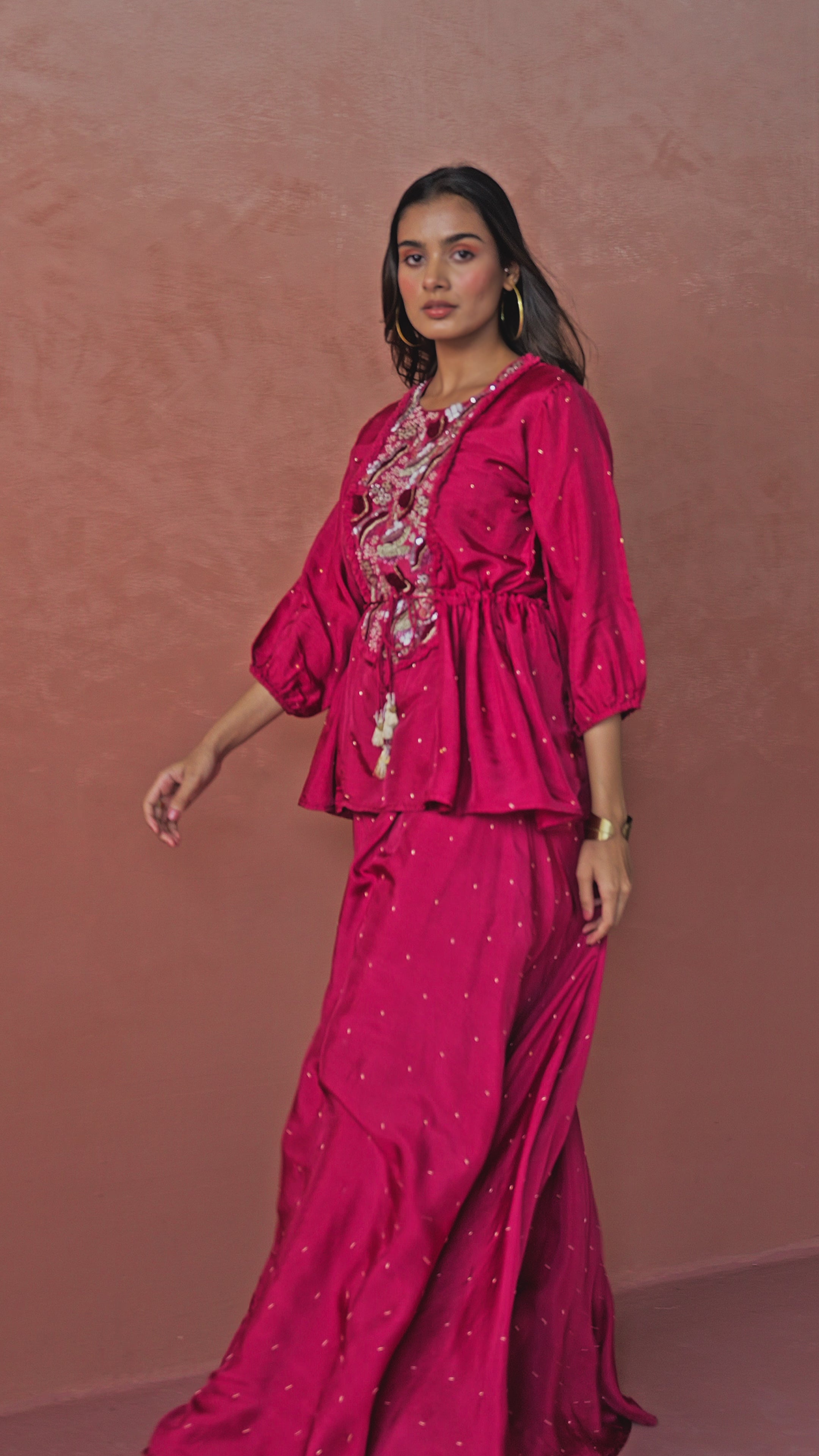 Features a cropped inner top, a drawstring peplum overlay, and wide-legged palazzo pants.