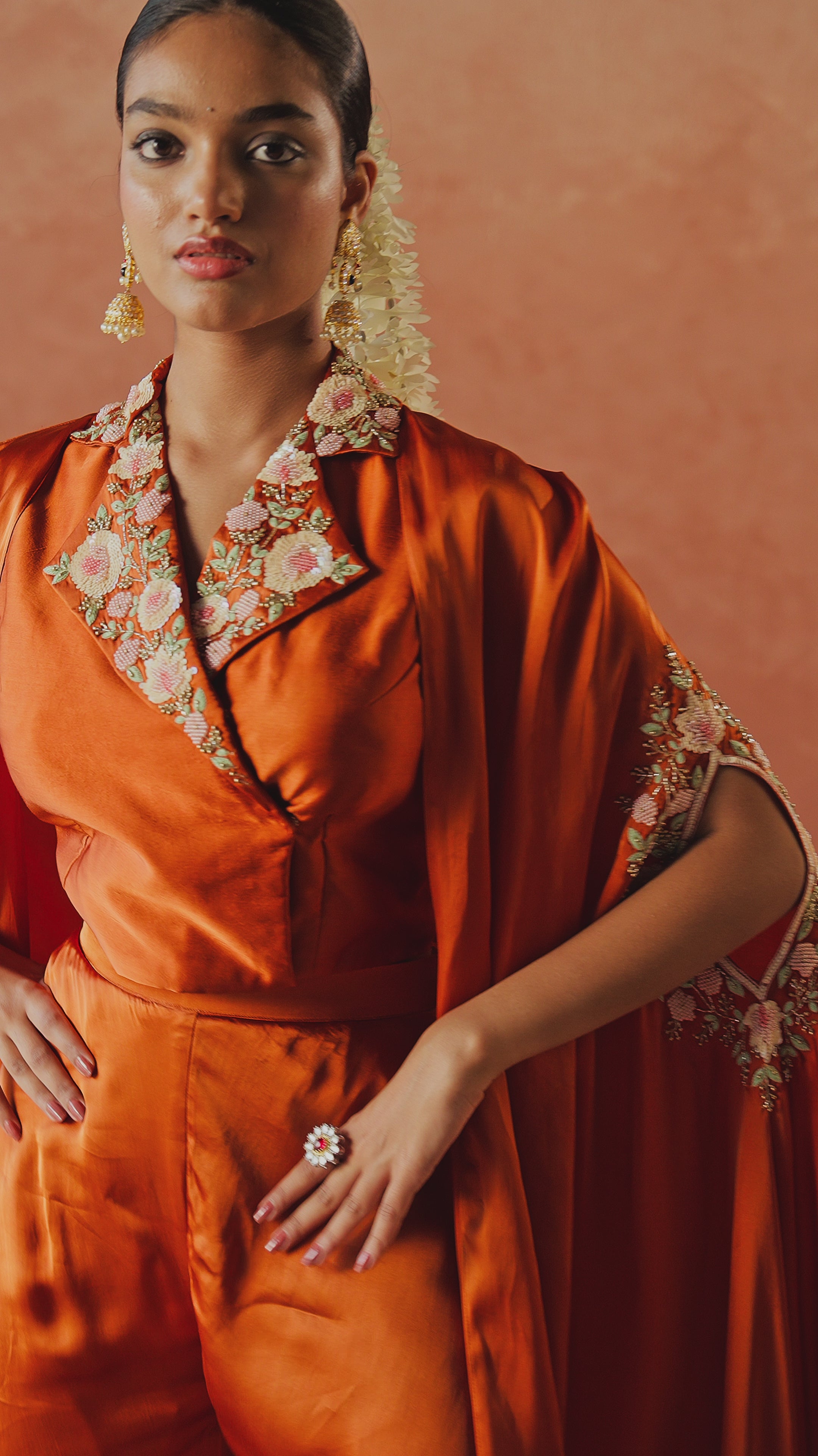 This stunning Indo-Western cape set exudes contemporary luxury and traditional charm. The ensemble features a padded crop top with a chic collar, beautifully embellished with intricate beadwork and sequins for a touch of glamour. The satin silk cape drapes gracefully, adding an element of sophistication, while the palazzo offers a comfortable yet stylish fit.
