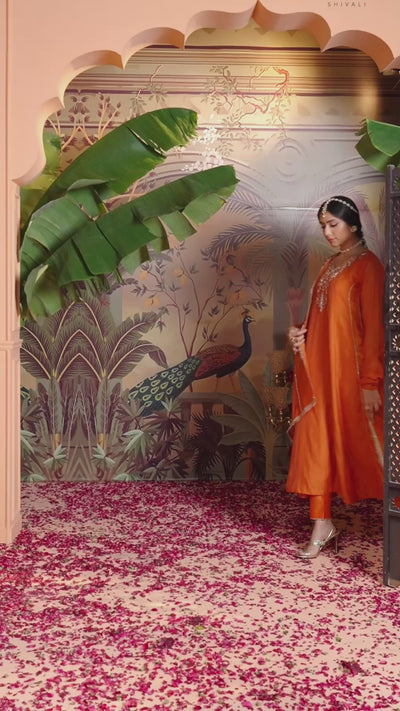 Saffron Orange Embellished Chanderi Silk Pant Set