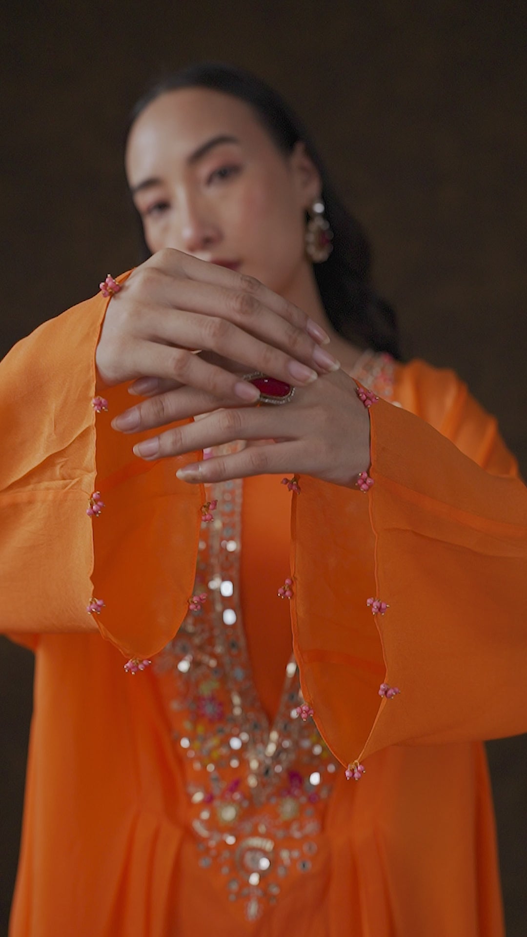 This is a striking three-piece set featuring a bright Tangerine Orange asymmetrical kurta/cape worn over a hot pink/orange ombre drape skirt.