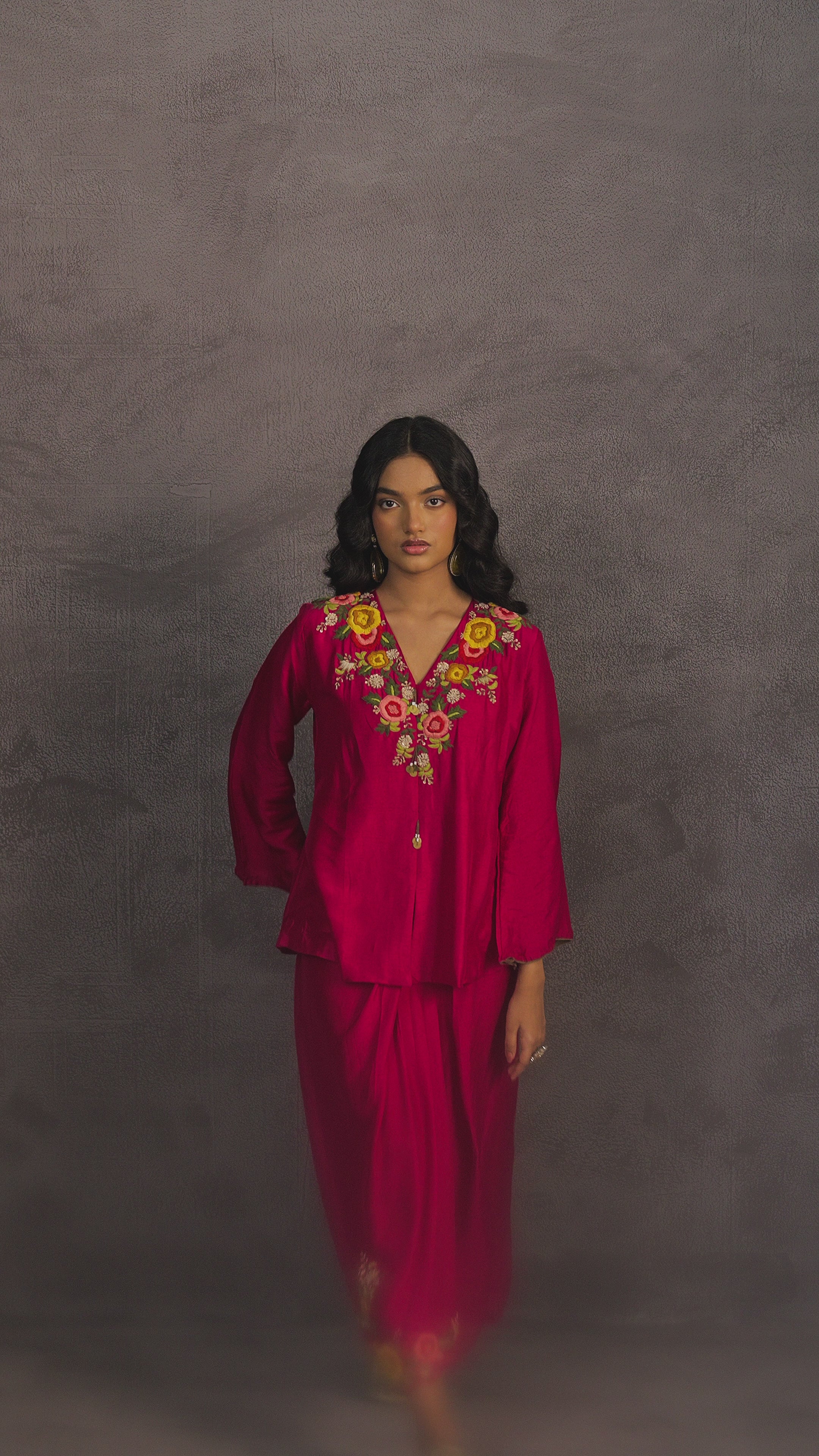 This elegant ensemble in Rani Pink is crafted from luxurious raw silk fabric. It features intricate floral thread embroidery with sequin detailing around the neckline and hem, paired with a stylish draped skirt — perfect for festive gatherings and celebratory occasions.