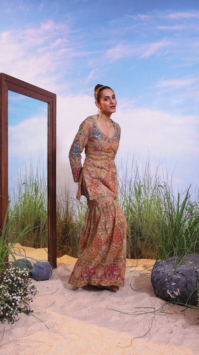 This exquisite Kurta and Sharara Set features a rich, Tan beige-toned base completely covered in a dense, flowing Paisley pattern of heavy multi-color thread embroidery and golden zari. The entire ensemble is further embellished with dazzling sequins and mirror work for an opulent, festive finish.
