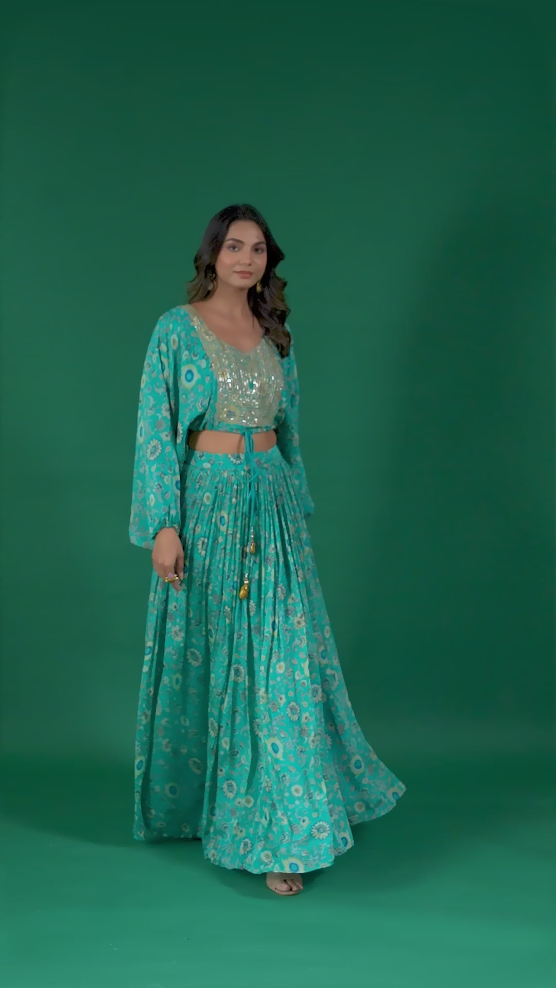 Sapphire blue embellished and floral printed premium chinon silk crop top, Styled with flared sleeves. Crafted with intrinsic sequin, mirror and cut dana handwork embroidery. Paired with matching can can skirt. Apt for semi formal wear.
