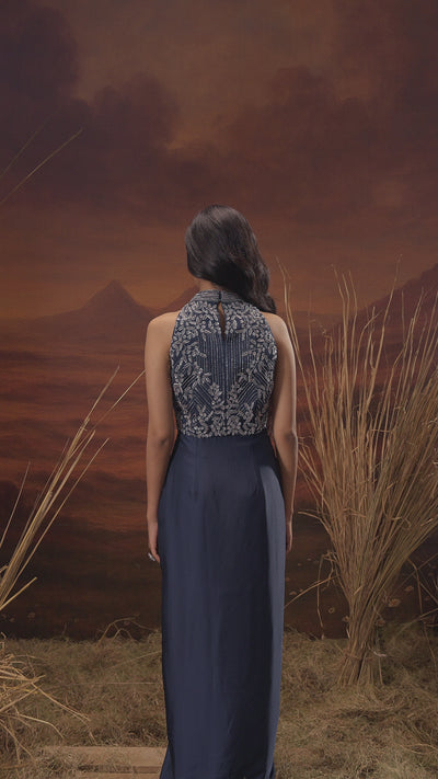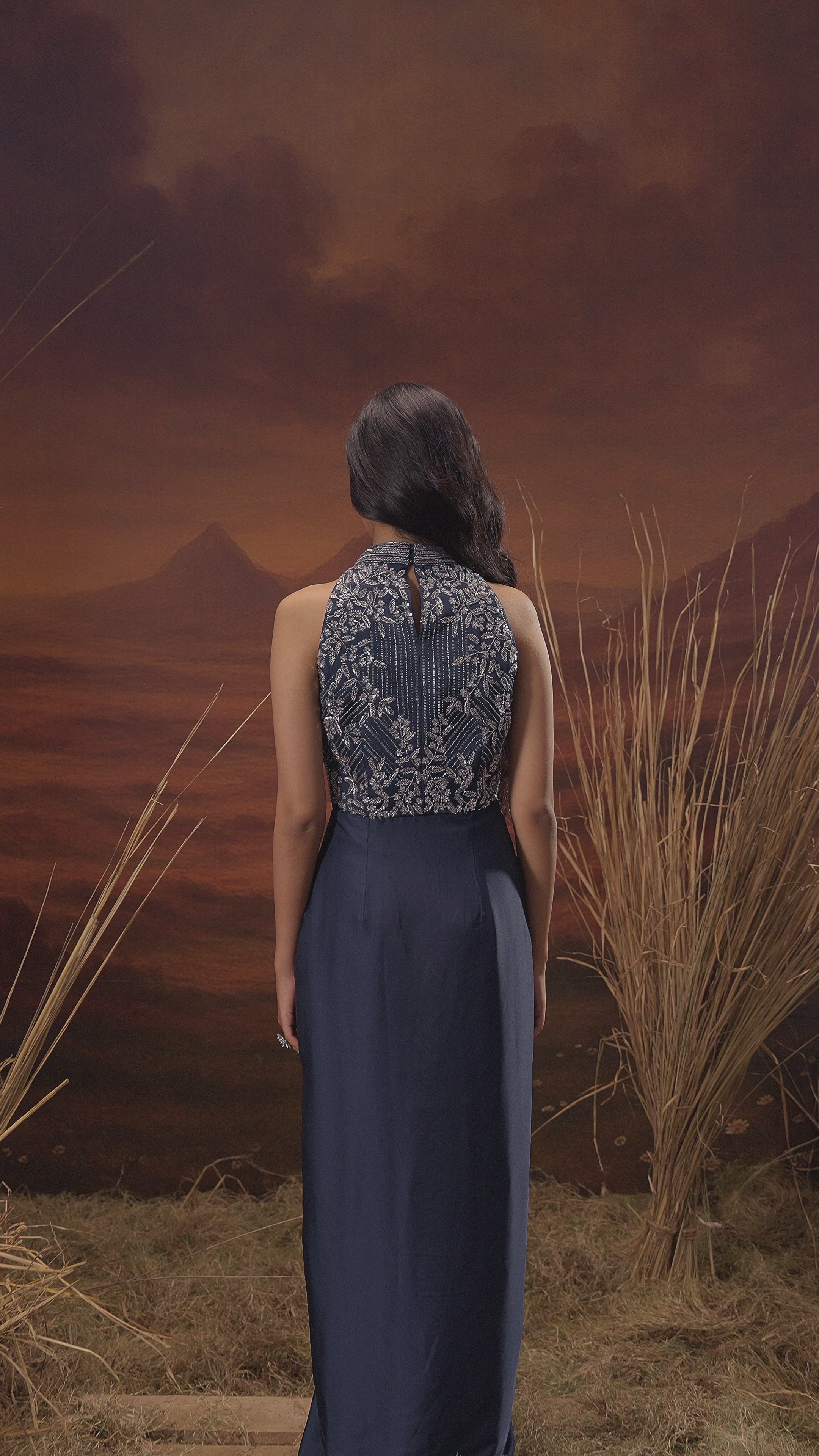 Exude sheer glamour in this sophisticated Sapphire Blue Satin Silk Gown, featuring a beautifully embellished high-neck bodice and an elegantly draped skirt.