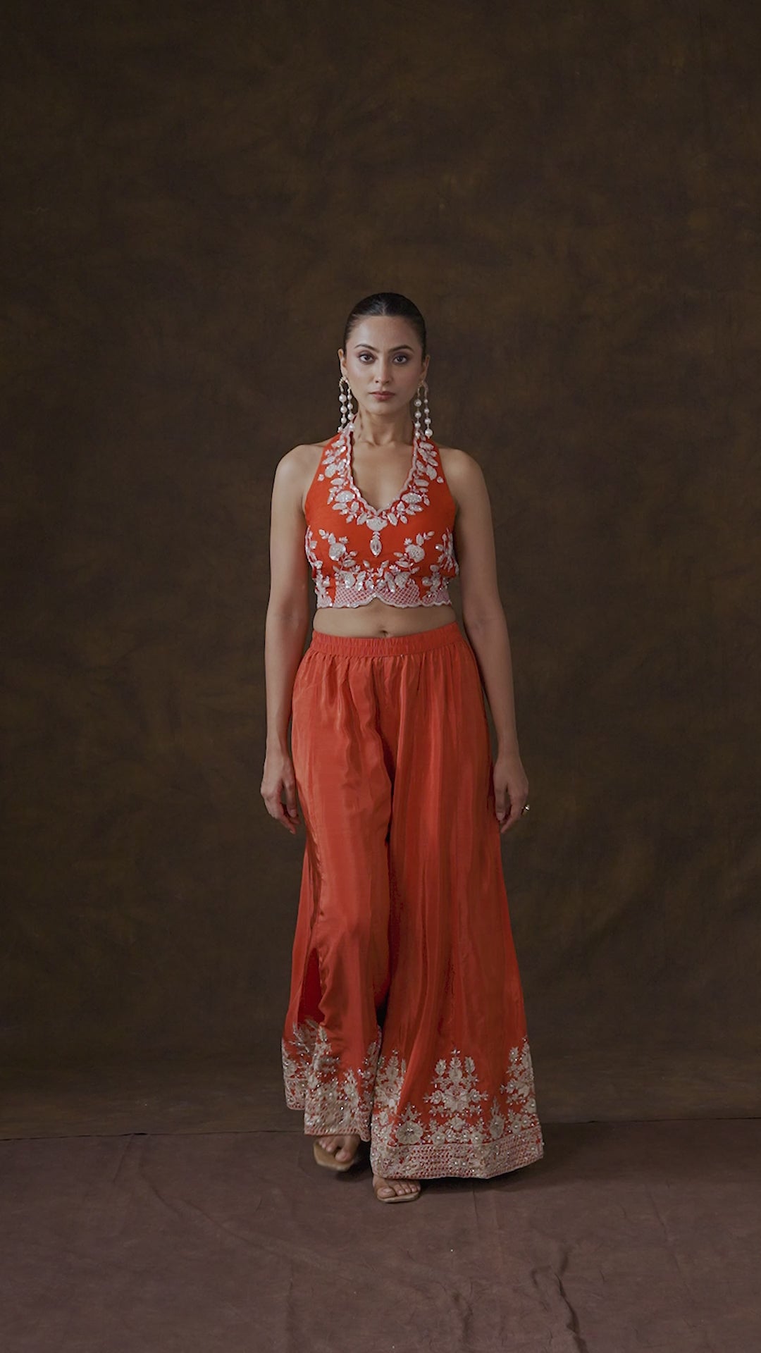 Scarlet Orange Embellished Satin Silk Palazzo Set