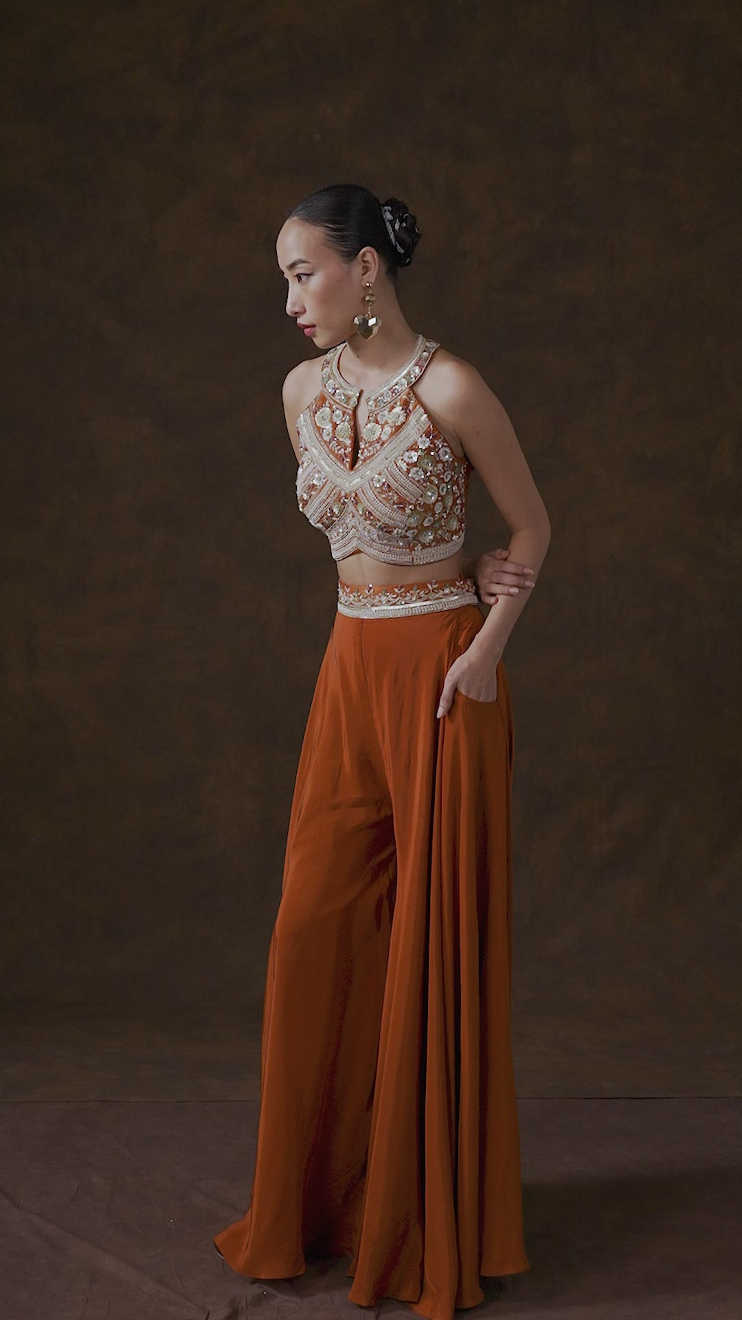 The ensemble features a structured, halter-neck crop top paired with dramatically flared, wide-leg palazzo pants.