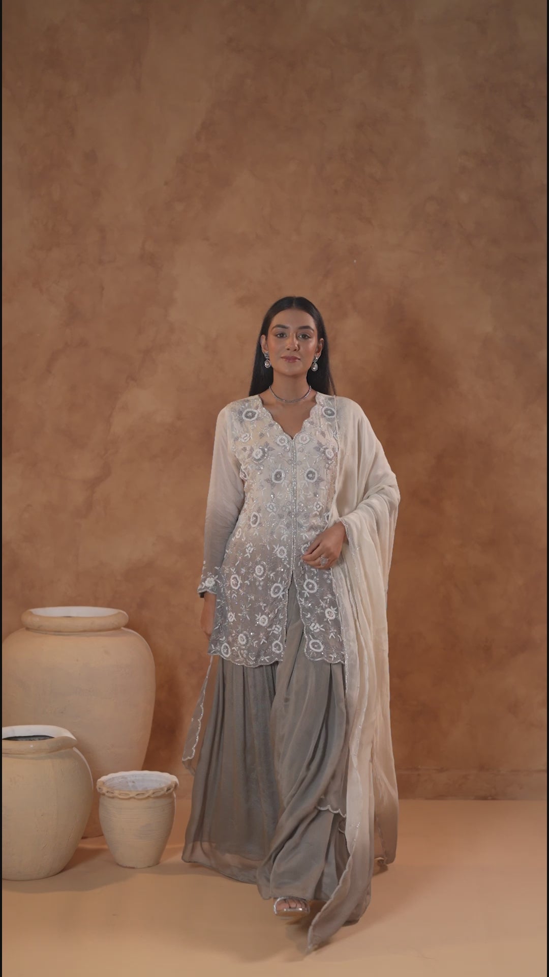 Exude serene sophistication in this beautiful Shaded Grey Sharara Set. The set features a flowing kurta, expertly blending Ivory and Grey tones, and a matching voluminous sharara, all crafted from soft Chinon silk. The ensemble is exquisitely detailed with intricate white cut-dana, threadwork, and pearl hand embellishments, beautifully complemented by a sheer ombre organza dupatta.