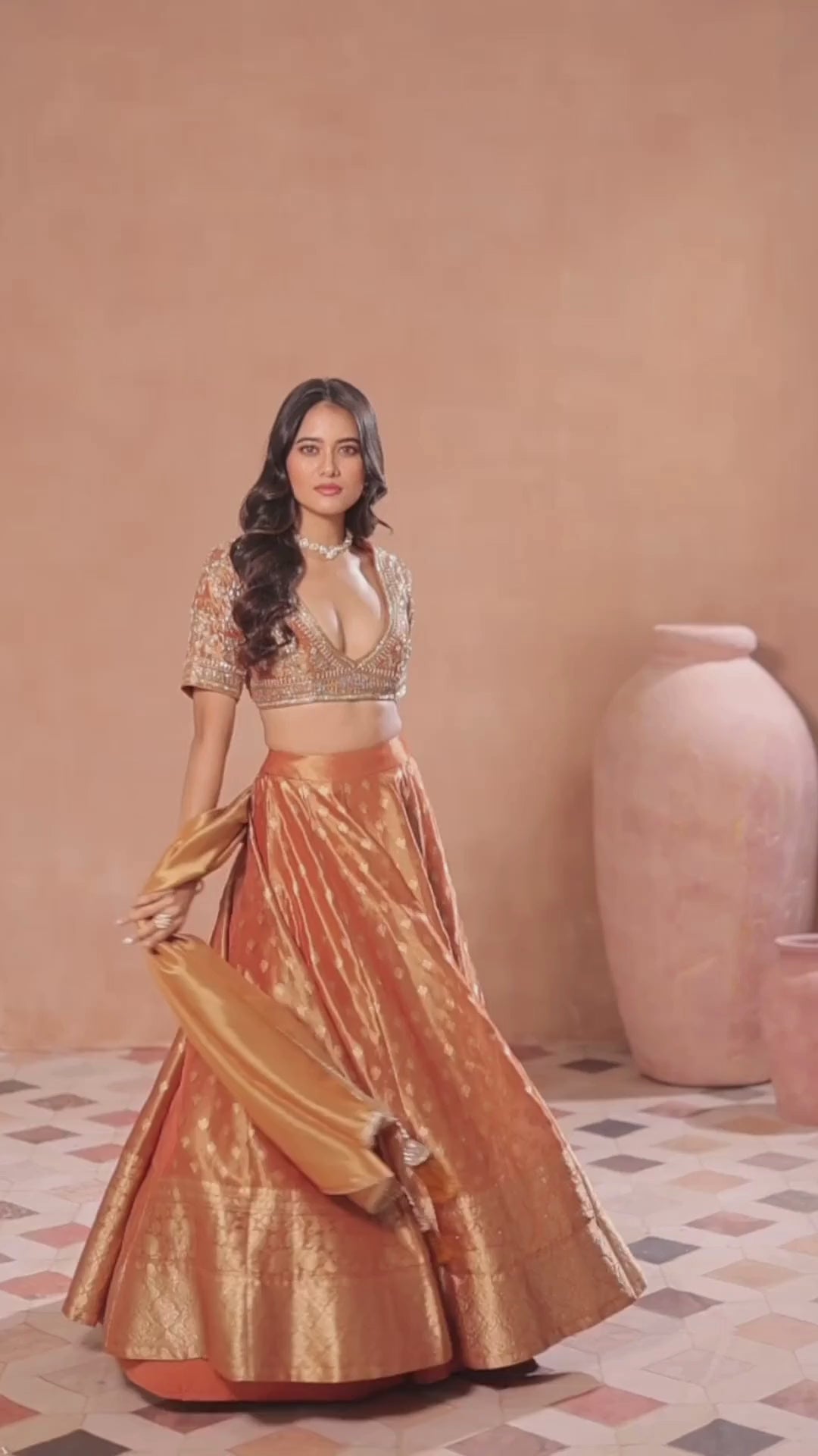 Introducing our Shimmer Copper Embroidered Premium Brocade Silk Lehenga Set. This exquisite ensemble showcases intricate bead, aari tari, zardosi and sequins handwork on the top, adding a touch of elegance. Paired with a beautifully flared lehenga featuring heavy tassels and a matching dupatta, this set is perfect for festive occasions and celebrations.