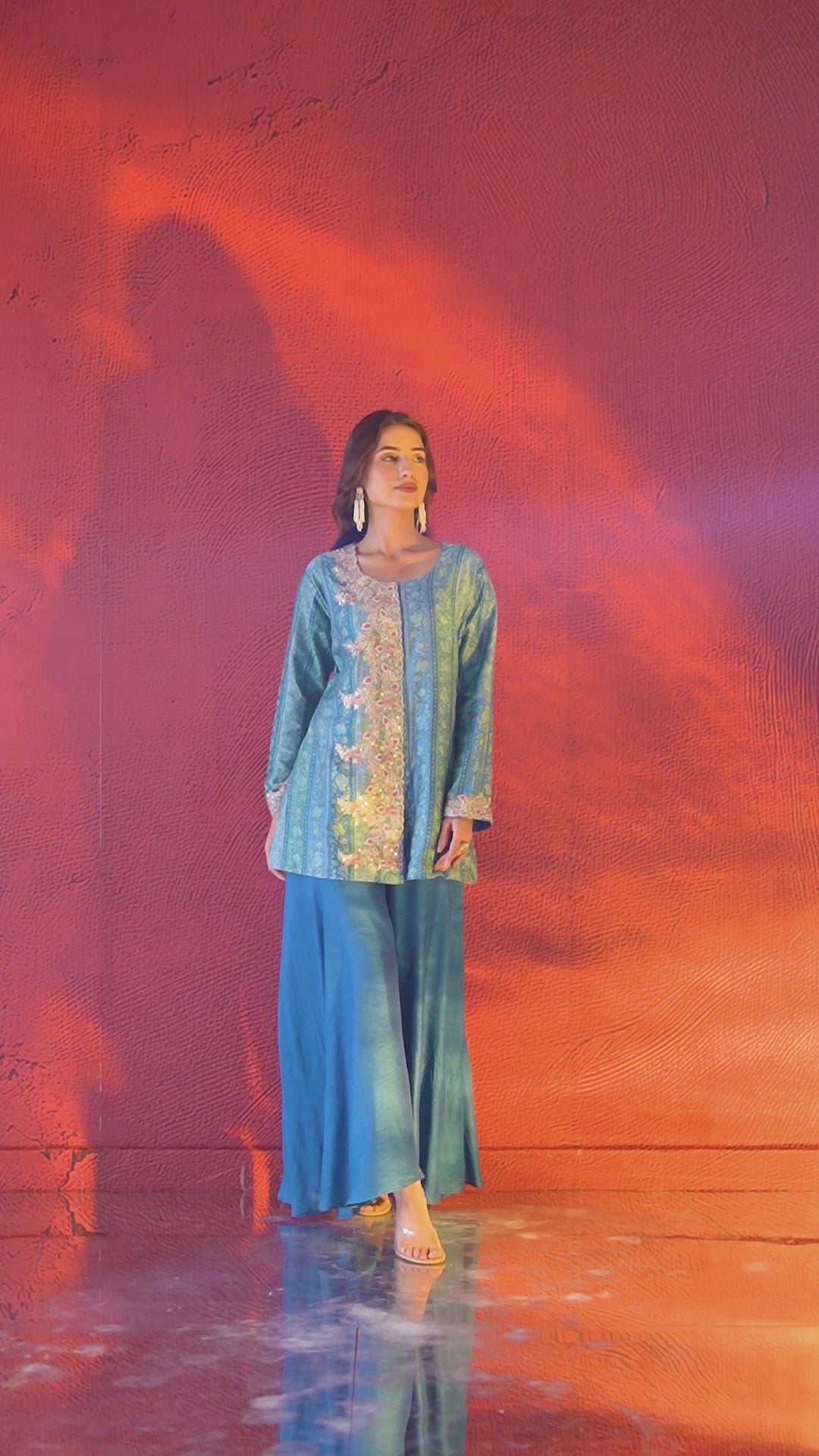 This Sky Blue Digital Printed Spanish Silk jacket and palazzo set is the epitome of grace and lively fashion. The jacket is adorned with intricate zari, aari tari, sequin, resham thread work on it. The look is complete by matching solid raw silk palazzo pants. Perfect wear for special occasions.