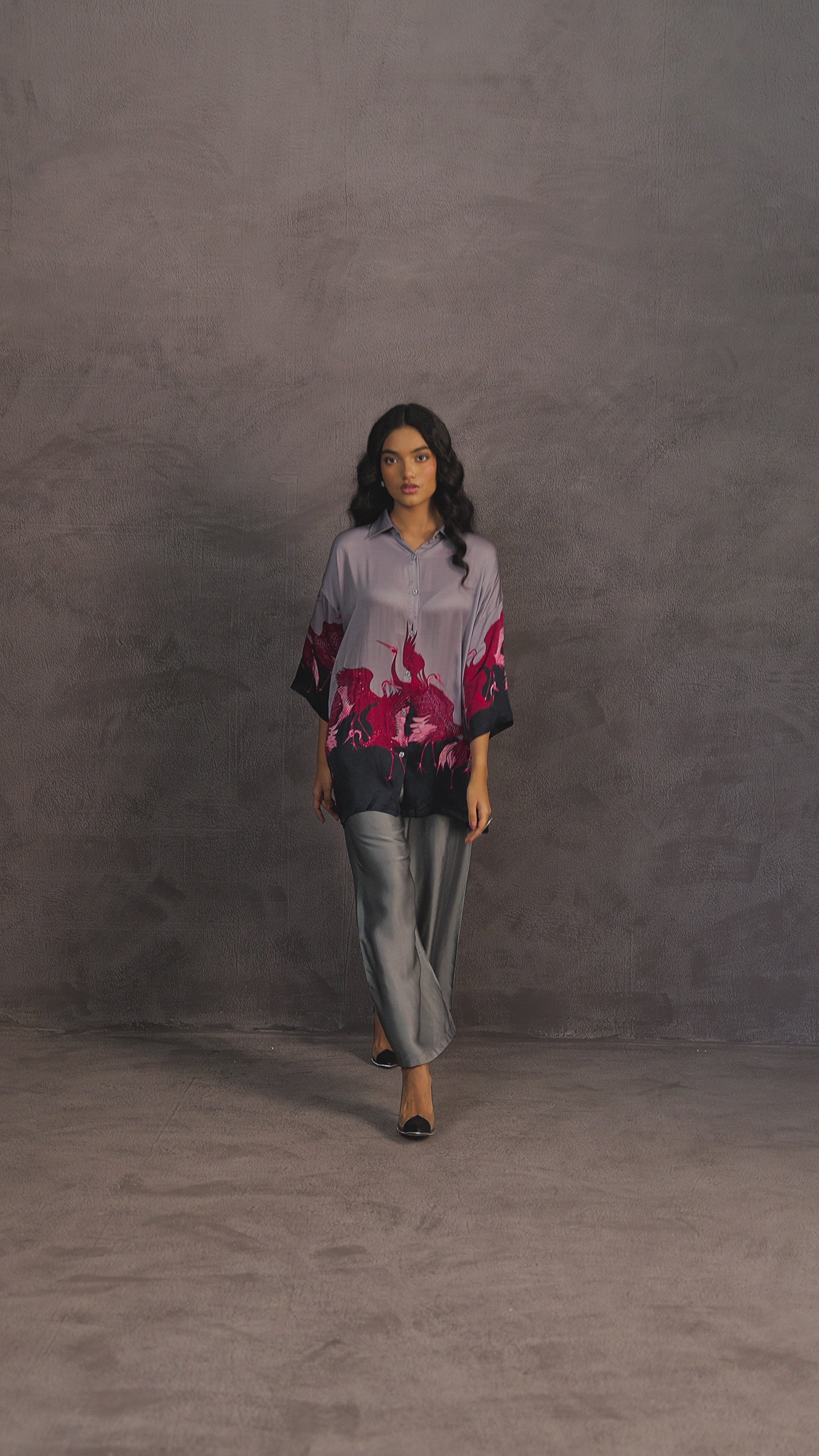The satin silk shirt features intricate crane motifs adorned with cut dana, sequins, and elegant print detailing.