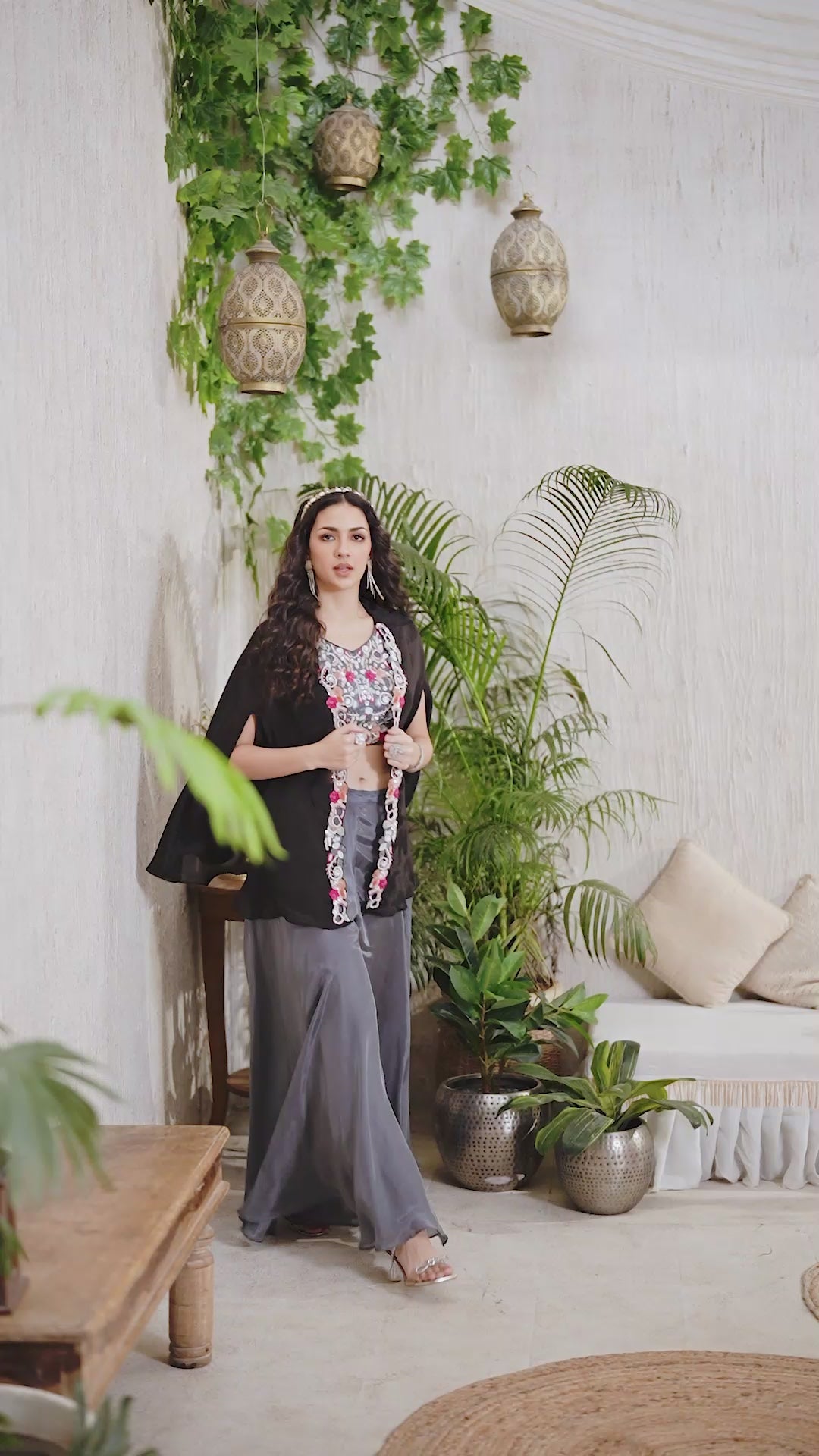 This elegant outfit is a three-piece set featuring Crepe Silk fabric for the crop top, palazzo, and flowing cape, providing a beautiful drape and subtle sheen. The ensemble is richly embellished with traditional Indian handwork, including sparkling beads, vibrant colorful sequins, and intricate zari embroidery around the neckline and borders. It's a contemporary take on ethnic wear, perfect for celebrations.