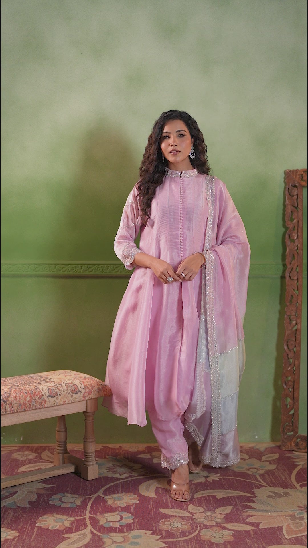 This exquisite set features a shimmery, embellished kurta and pant in soft Pastel Pink. It is stunningly paired with a sheer, pastel color-blocked dupatta that is beautifully and heavily embellished along the borders, creating a cohesive and luminous festive look.