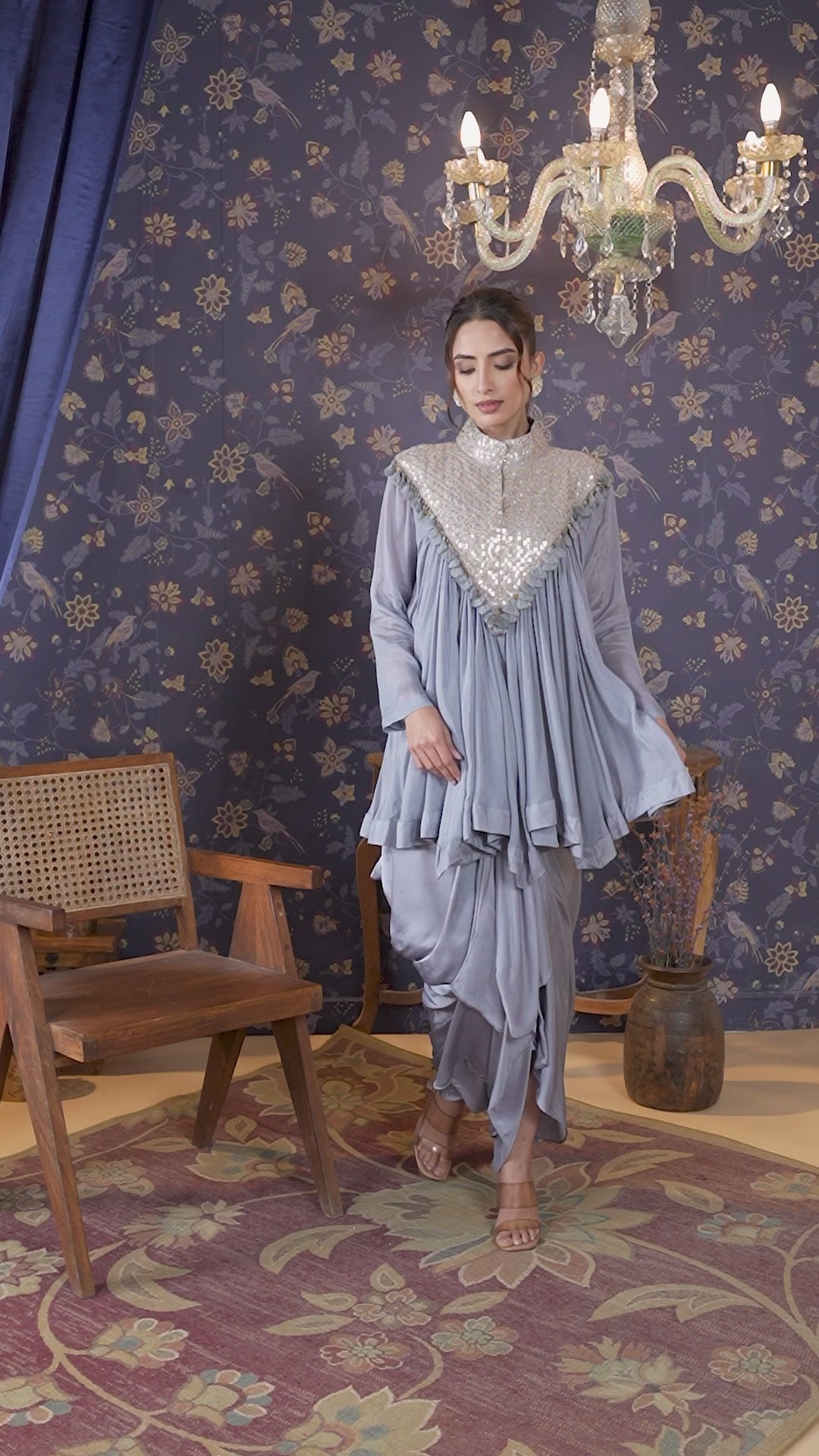 Spanish Grey Gota Embroidered Chinon Silk Draped Skirt & Top