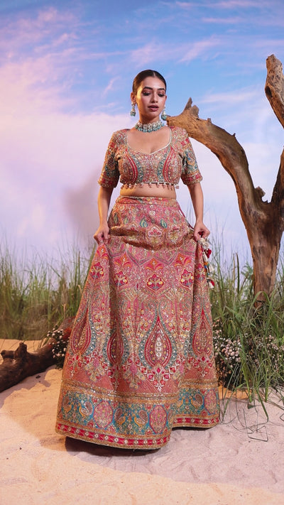 A magnificent Sunset Pink Raw Silk Lehenga Set featuring a voluminous A-line skirt and cropped blouse, both heavily embellished with intricate multi-color zari, sequin, and bead work in a striking paisley pattern, complemented by traditional Gotapatti and mirror detailing.