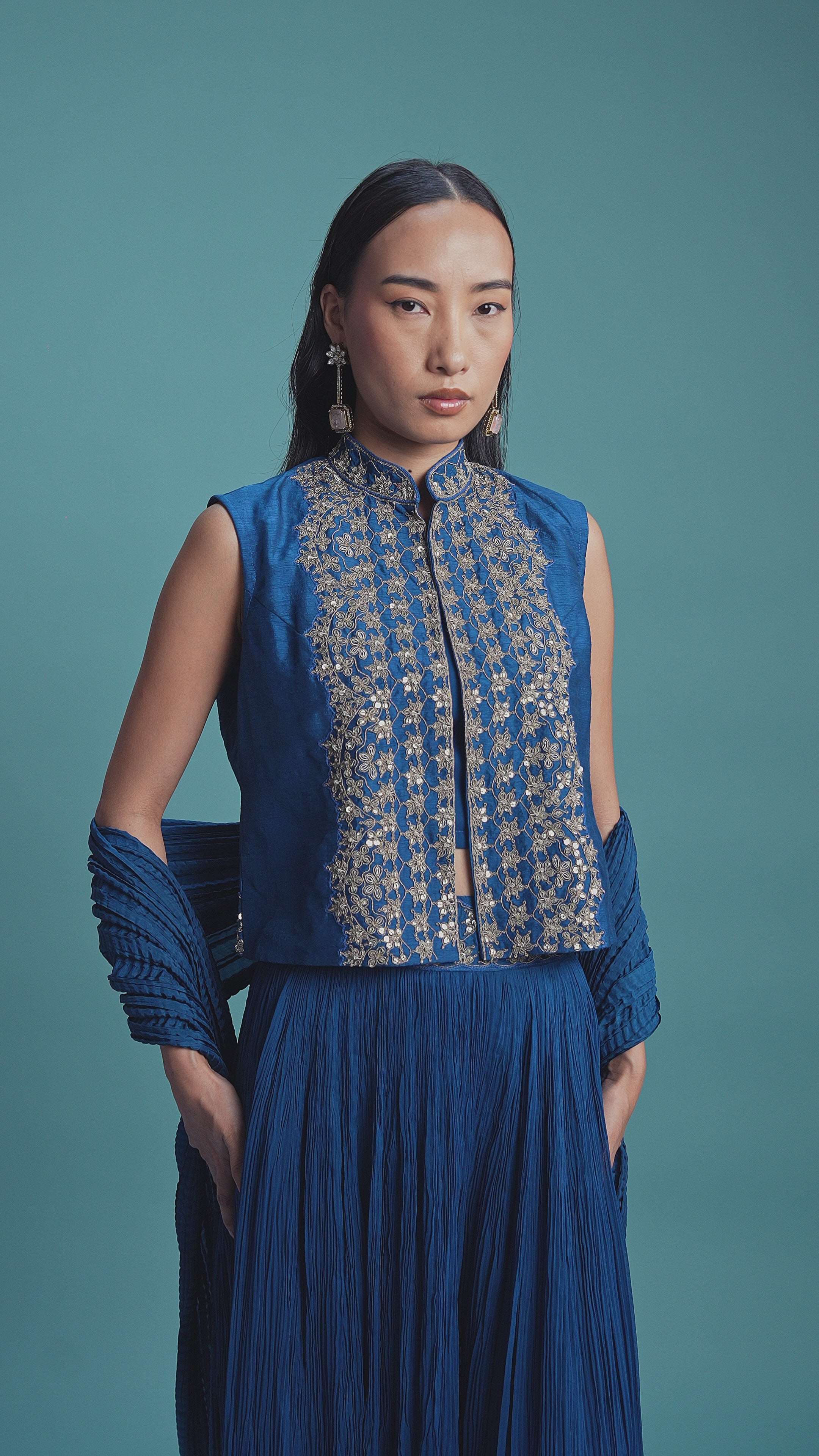 Command attention in this magnificent Teal Blue Lehenga Set. This four-piece ensemble features a pleated georgette silk skirt and inner, a statement raw silk jacket with intricate golden handwork, and a beautifully draped satin silk dupatta with a unique ombre effect.