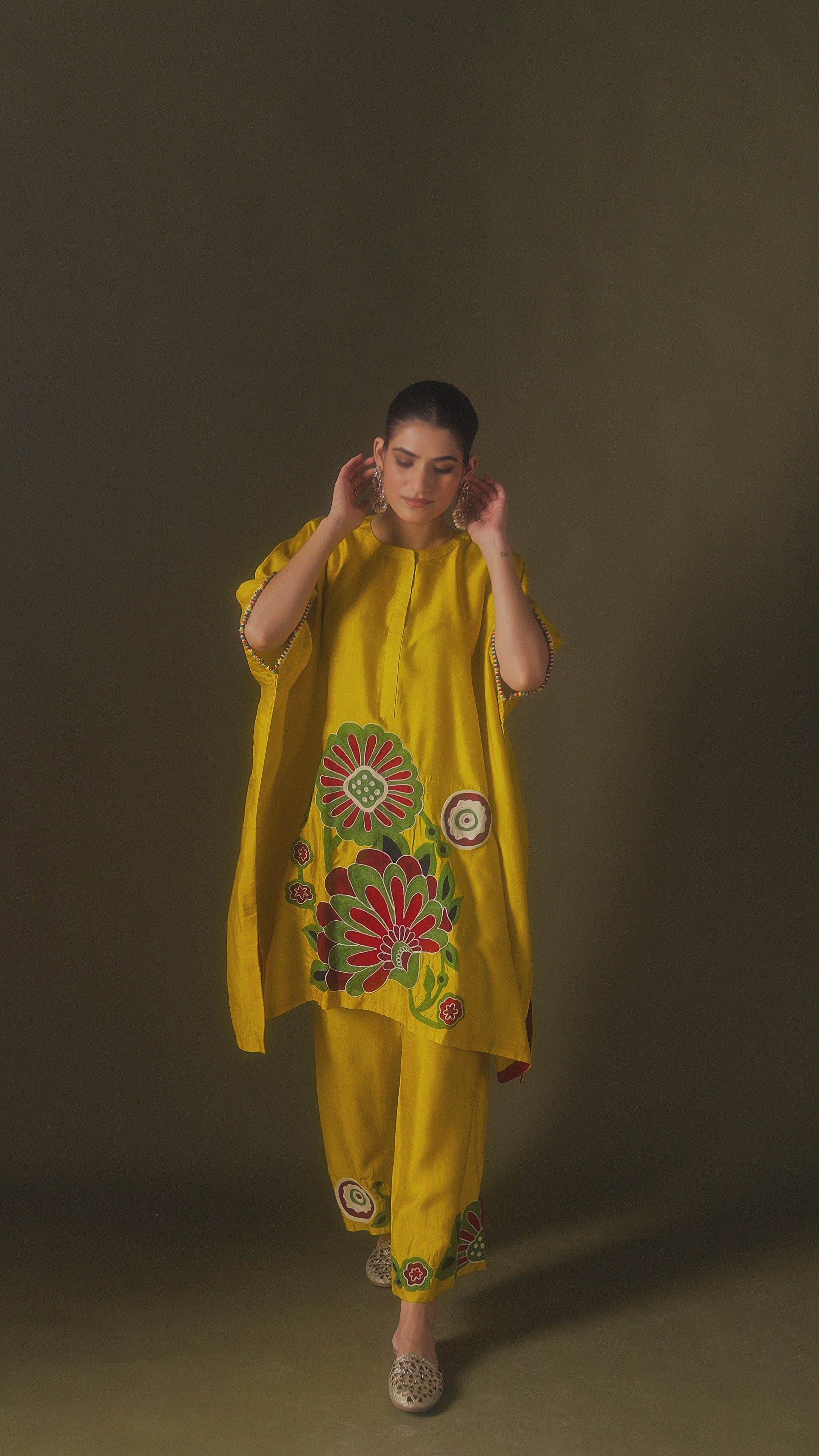 Radiate joy and vibrancy in this Lemon Yellow Embellished Kaftan Set, crafted from premium silk for a rich and fluid drape. The breezy kaftan silhouette offers relaxed elegance with a modern edge, perfect for daytime festivities or intimate gatherings. Bold floral appliqué and embroidery in shades of deep red, green, and ivory adorn the front and hemline, adding a striking contrast and artisanal charm. Intricate detailing on the sleeves and pants enhances the overall aesthetic without overwhelming the design. The set includes straight-cut trousers with coordinated floral motifs, bringing harmony and balance to the ensemble. Lightweight and easy to wear, this set combines comfort with festive finesse. Pair with statement earrings and embroidered jutties to complete the look. Ideal for brunches, Haldi functions, or festive celebrations where tradition meets playful sophistication.