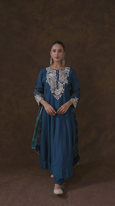 Embrace timeless grandeur in this opulent Teal Blue Anarkali Set. This three-piece ensemble features a flowing raw silk kurta with a spectacular, heavily hand-embellished yoke adorned with intricate paisley motifs, sequins, beads, and cut dana work. The look is completed with matching raw silk pants and a smooth satin silk dupatta featuring a beautiful, traditional Bandhini print.