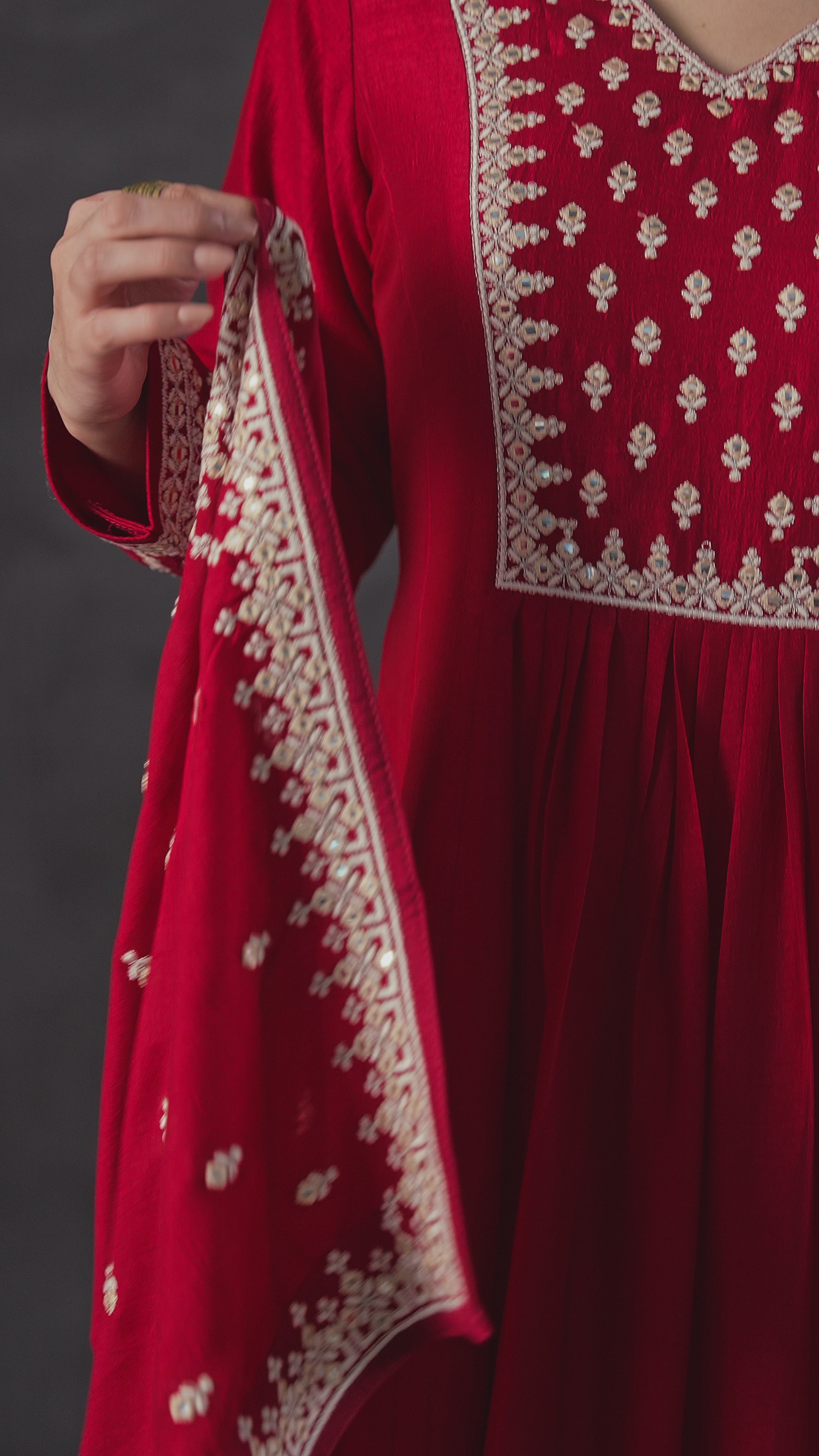 Elevate your festive and wedding wardrobe with this timeless Red Embellished Anarkali Set, exquisitely crafted in rich raw silk. The ensemble features a flattering V-neckline and intricate hand embroidery in golden Zari and mirror work, delicately placed across the yoke, sleeves, and hem Paired with straight-fit silk pants and a beautifully embroidered dupatta, the set blends elegance and tradition seamlessly. The flowing silhouette and detailed craftsmanship make it ideal for celebratory occasions and formal gatherings.