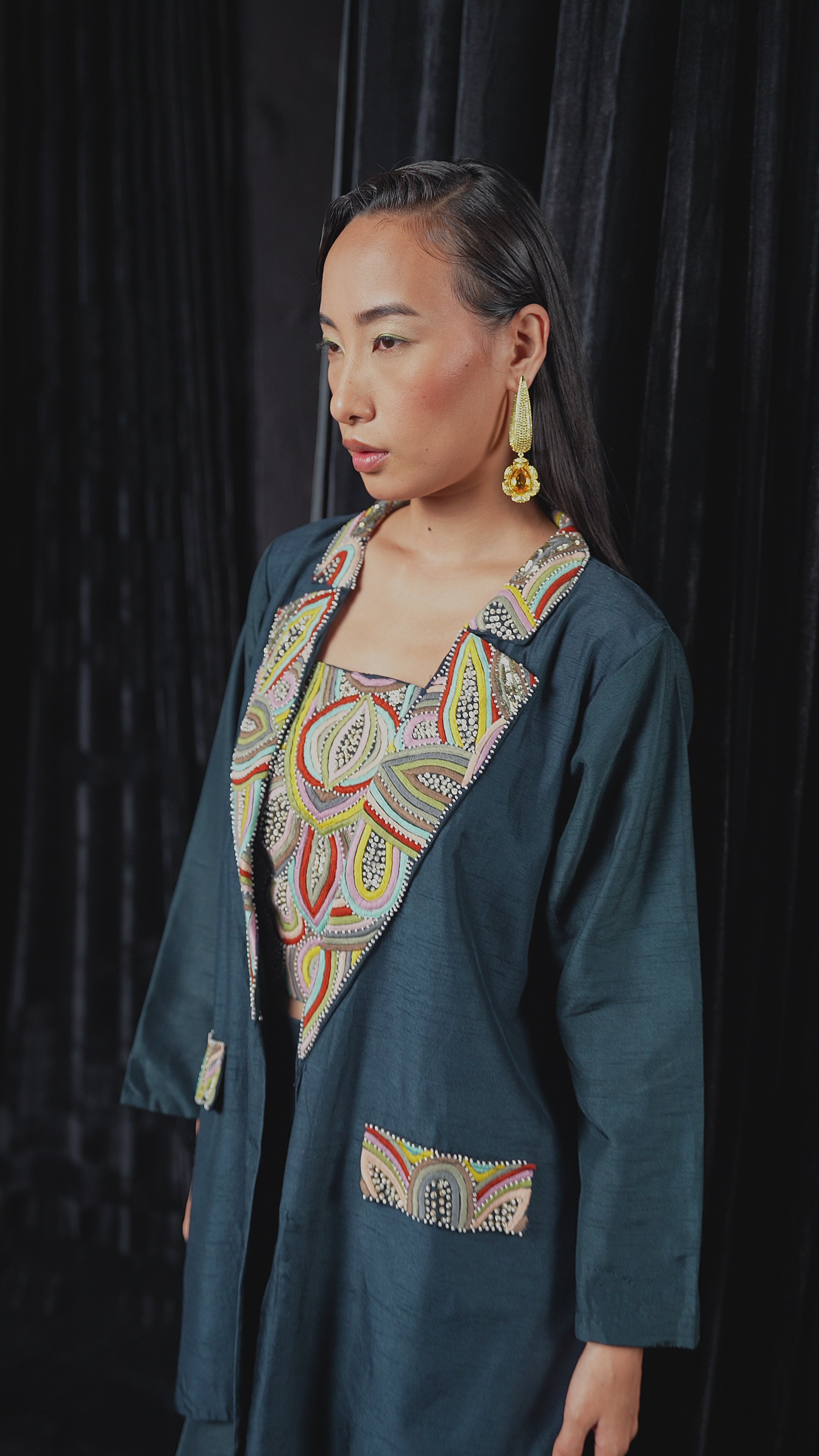 Work: Intricate hand embroidery with thread, sequins, and bead detailing on the jacket neckline, crop top, and pockets