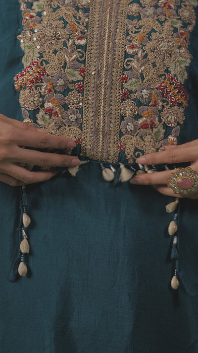 This elegant raw silk kaftan-style cape sleeve kurta set features a rich teal blue shade. It includes a solid inner and plain palazzo for a graceful silhouette. The kurta is beautifully embellished with sequins, beads, zari, thread work, and delicate sea shells, adding a touch of sophistication and charm. Perfect for festive and formal occasions.