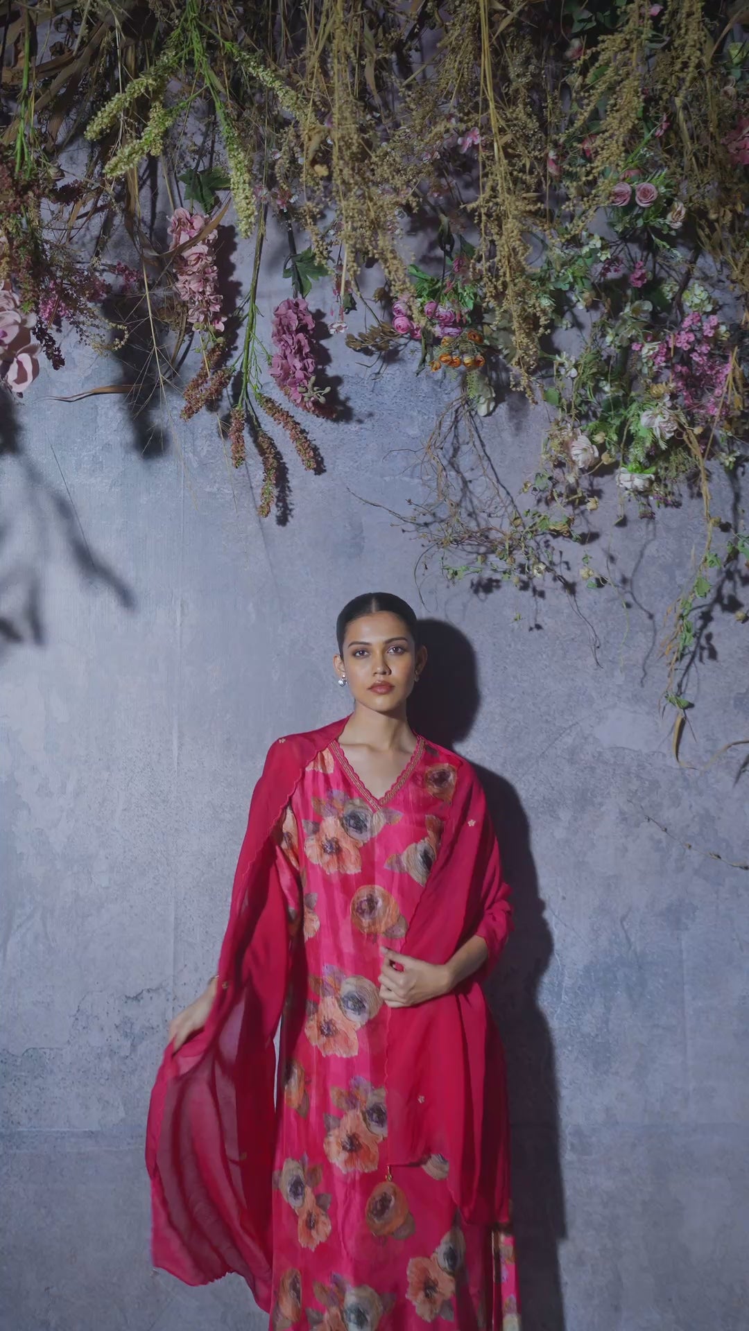 Make a bold statement with this vibrant red Tussar silk pants set, featuring striking floral prints in earthy tones. The kurta is designed with a flattering V-neckline and elegant three-quarter sleeves. Crafted from lightweight Tussar silk, it offers both comfort and sophistication. Paired with matching red straight-fit pants and a soft, sheer dupatta for a graceful finish. Perfect for festive occasions, daytime events, or elegant casual wear. Subtle sequin detailing adds a refined touch of sparkle.