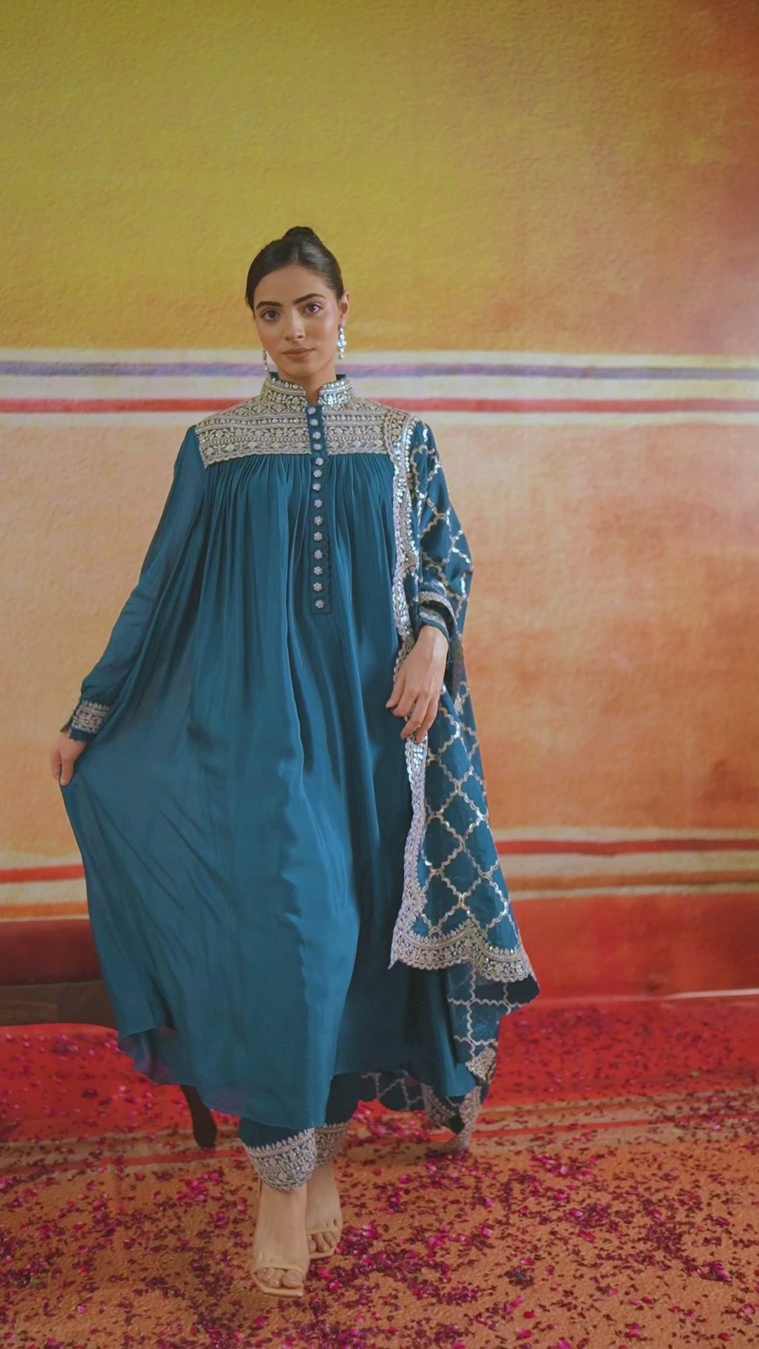Introducing our Teal embellished spanish silk flare kurta. Expertly crafted with intricate gota and aari taari handwork. Adorned with fabric buttons, jaal work and scallop border. Paired with matching pants and a chinon silk dupatta. Apt for semi formal wear.