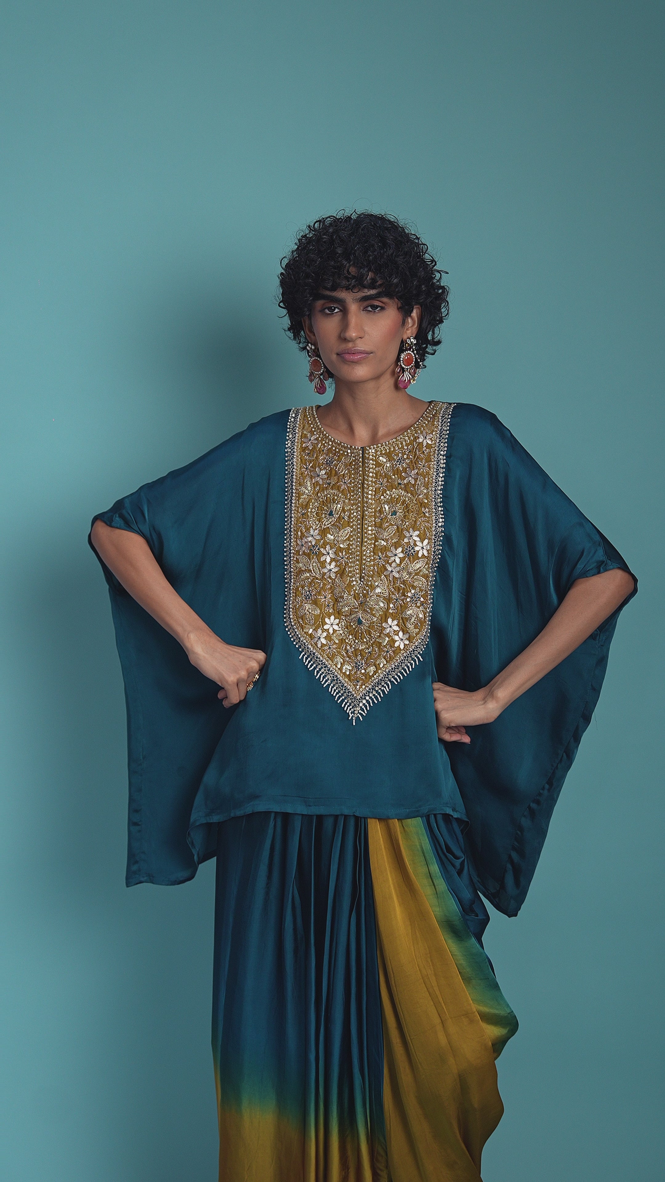 This striking ensemble is a teal green kaftan and drape skirt set, crafted from luxurious satin silk. The kaftan is a masterpiece of intricate handwork, beautifully embellished with a mix of cut dana, sequins, zari, beads, thread work, and Gota patti. The skirt adds a dramatic flair with its elegant drape and a stunning ombre dye effect that transitions from deep teal to a rich mustard yellow.