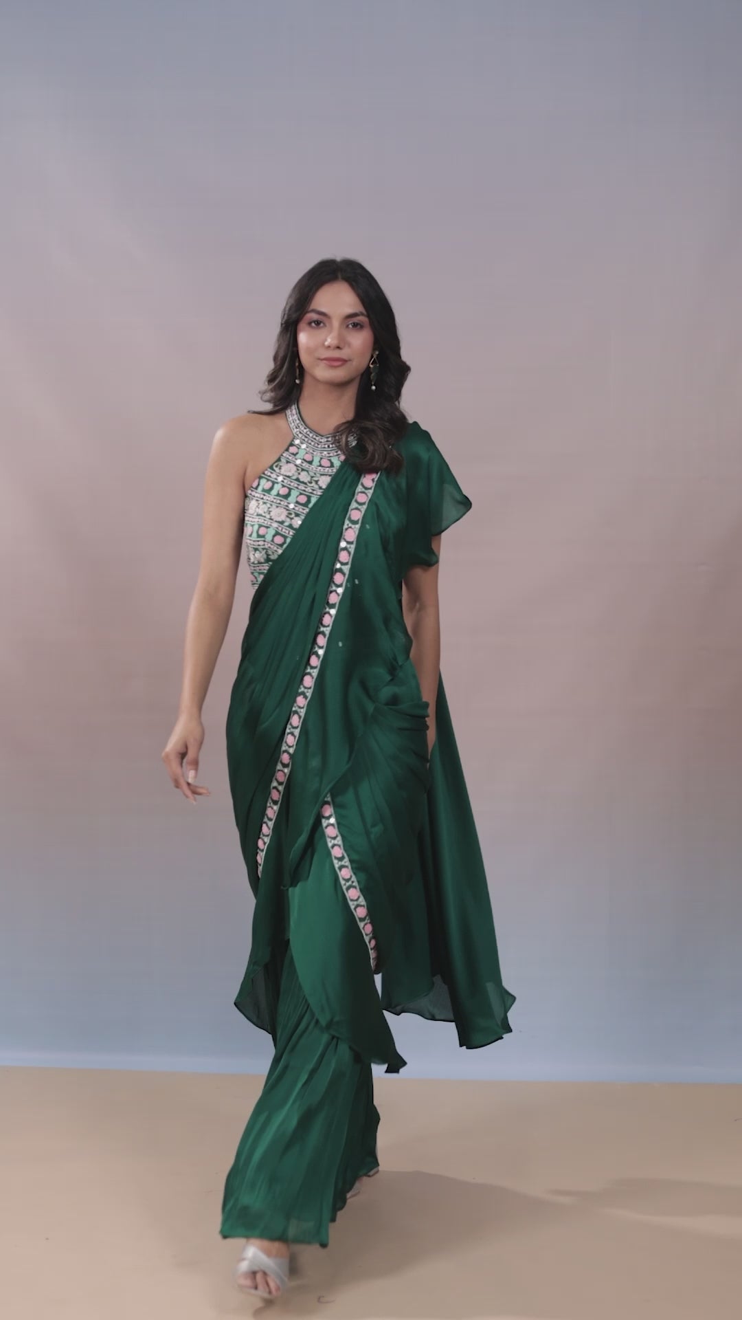 Teal green embroidered premium chinon silk crop top. Crafted with intrinsic mirror and thread handwork embroidery. Paired with matching draped saree. Apt for semi formal wear.