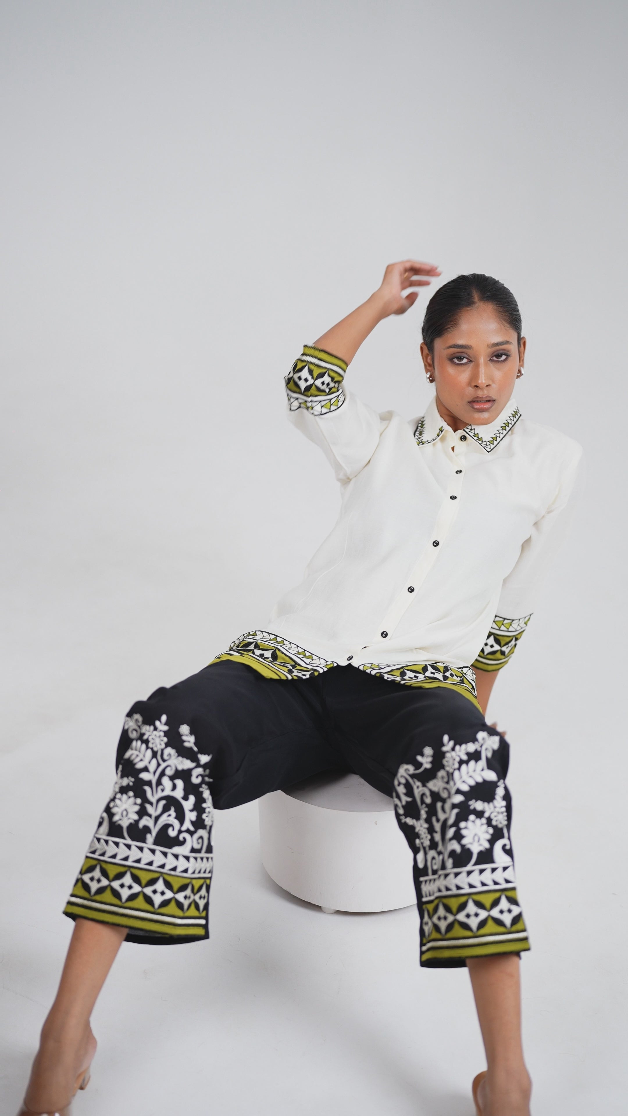 Embrace easygoing style with this charming co-ord set. The cream kurta-style top, decorated with playful tribal black and olive green patterns on the hem, cuffs, and collar, pairs perfectly with black palazzo pants featuring delicate white floral embroidery and a coordinating border. This fun and comfy outfit is your go-to for casual hangouts or festive fun, mixing ethnic vibes with modern flair effortlessly.