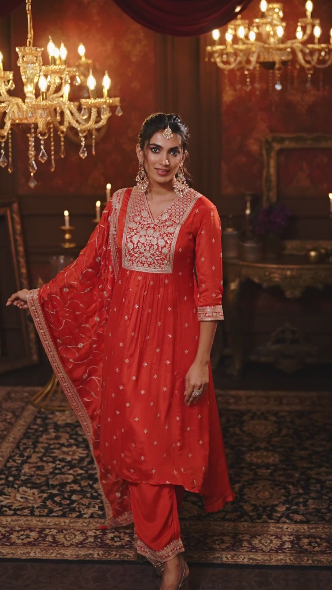 Make a dazzling entrance in this vibrant Vermillion Orange Pant Set. This three-piece ensemble, crafted from flowing Chinon silk, features an Anarkali kurta with a beautifully hand-embellished yoke. The rich metallic Zari and sequin work is mirrored on the sheer dupatta, which is intricately embroidered along the borders, enhancing the set's festive and elegant charm.