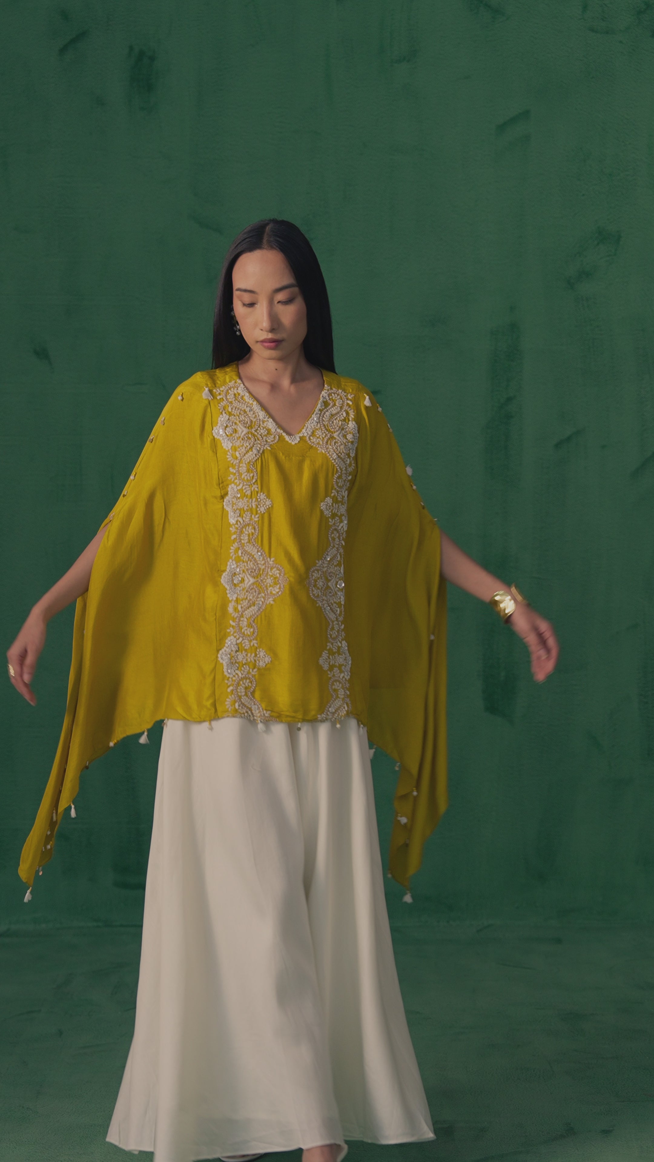 Vibrant mustard yellow raw silk kaftan paired with a solid inner.