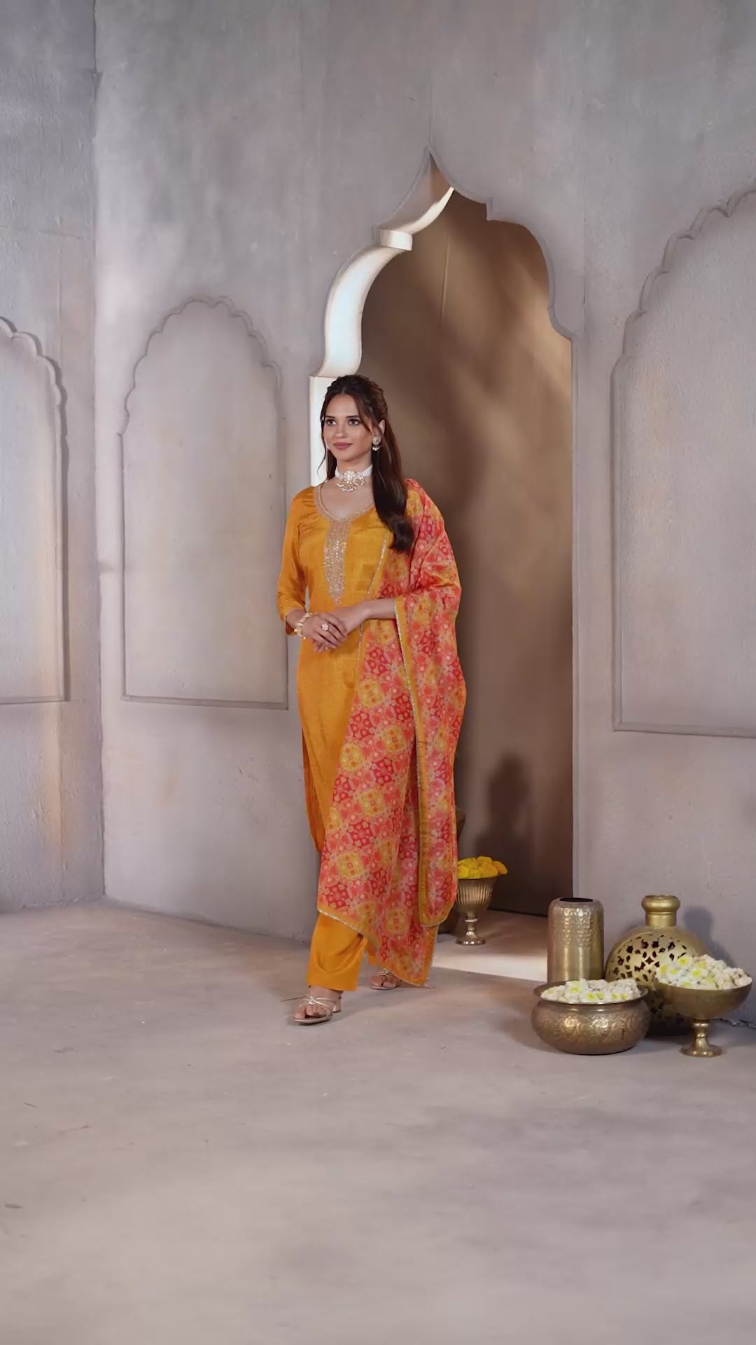 A bright yellow kurta-and-pant set is paired with a vibrant pink and yellow printed dupatta.