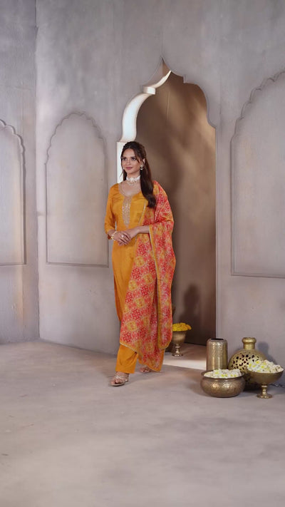 Deep Yellow Printed Dola Silk Pant Set