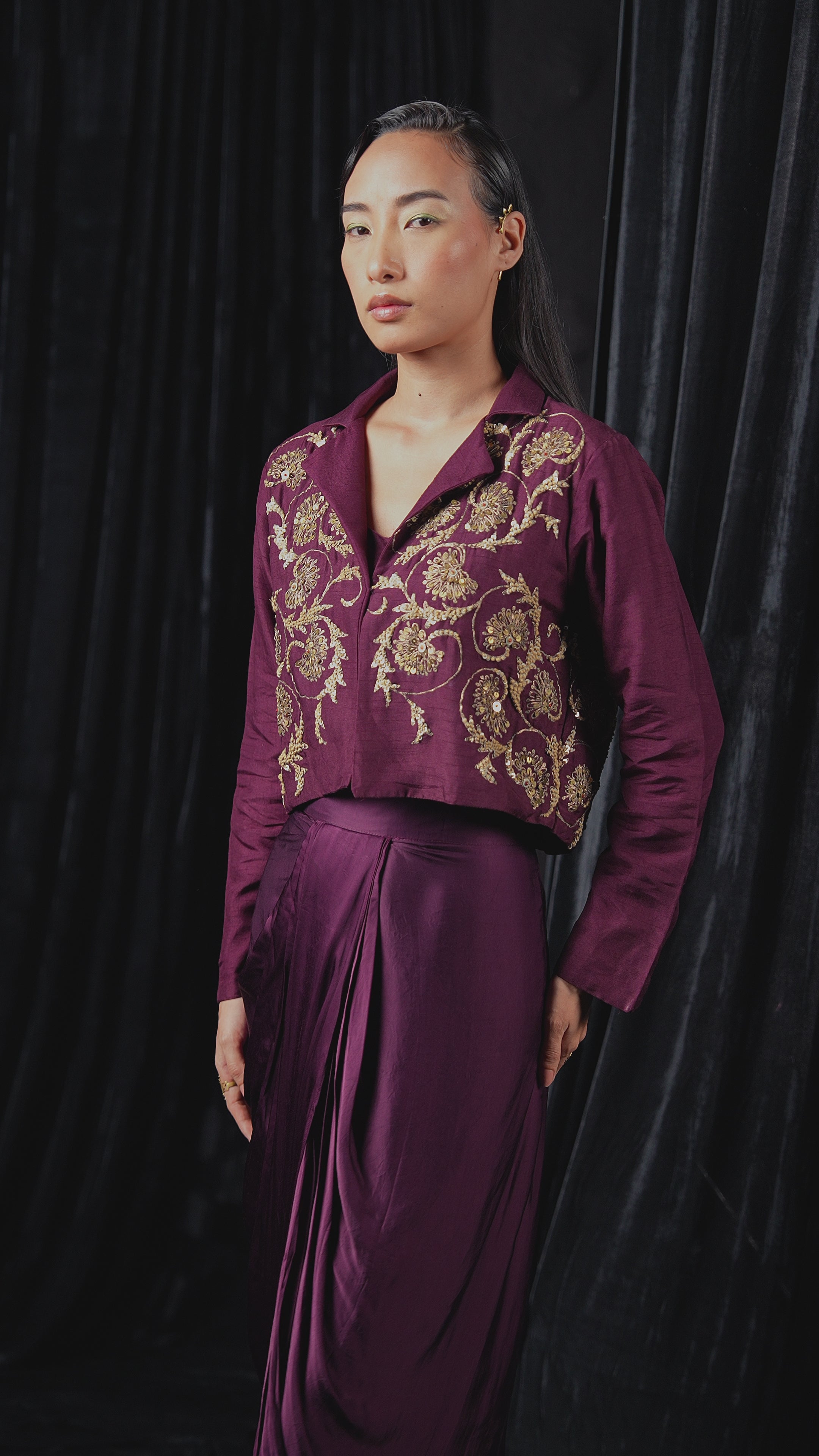 Step out in high-fashion style with this exquisite Wine Co-Ord Set. This three-piece ensemble features a modern draped satin silk skirt and a striking raw silk cropped jacket, intricately hand-embroidered with elegant golden details.