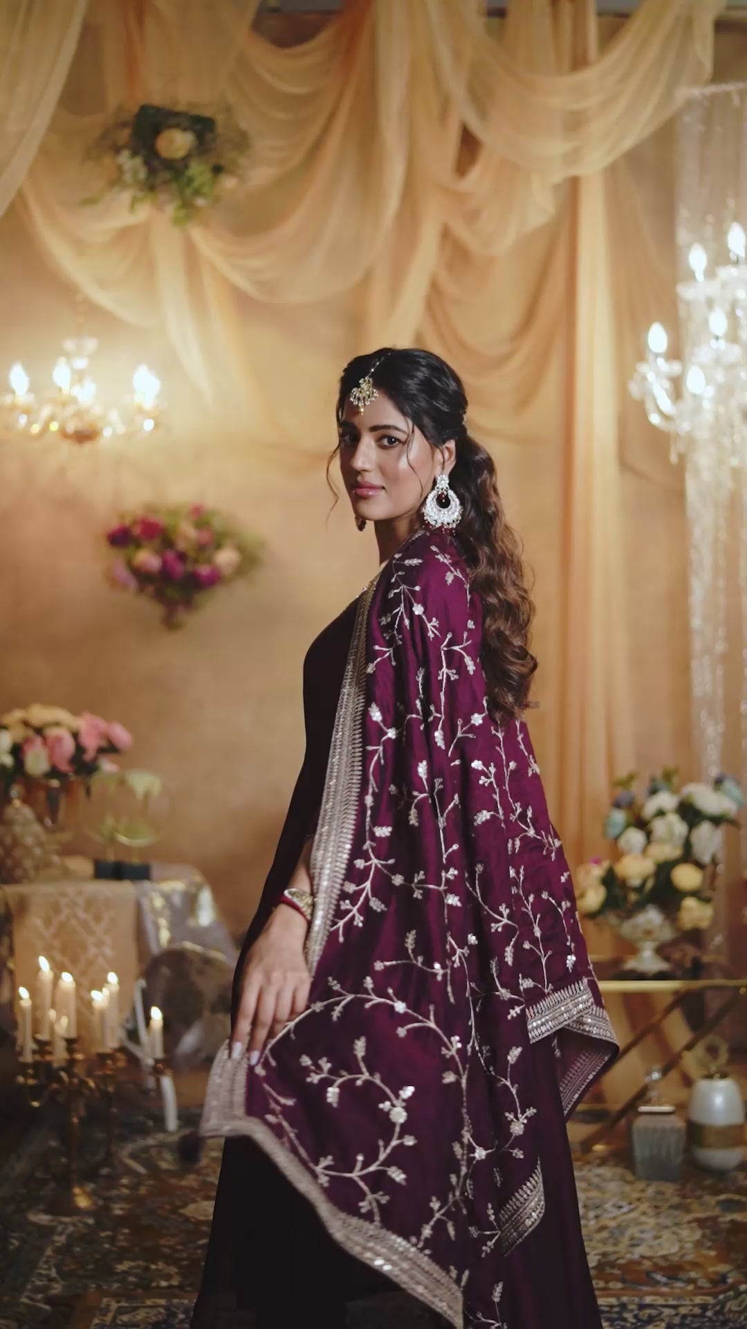 Step into elegance with our wine embellished raw silk kurta pants set. The kurta is adorned with zari, aari tari and sequins work in front which gives an elegant look. Paired with matching solid premium silk pants and a floral embellished premium silk dupatta with tassels on border. Perfect for semi-formal events.
