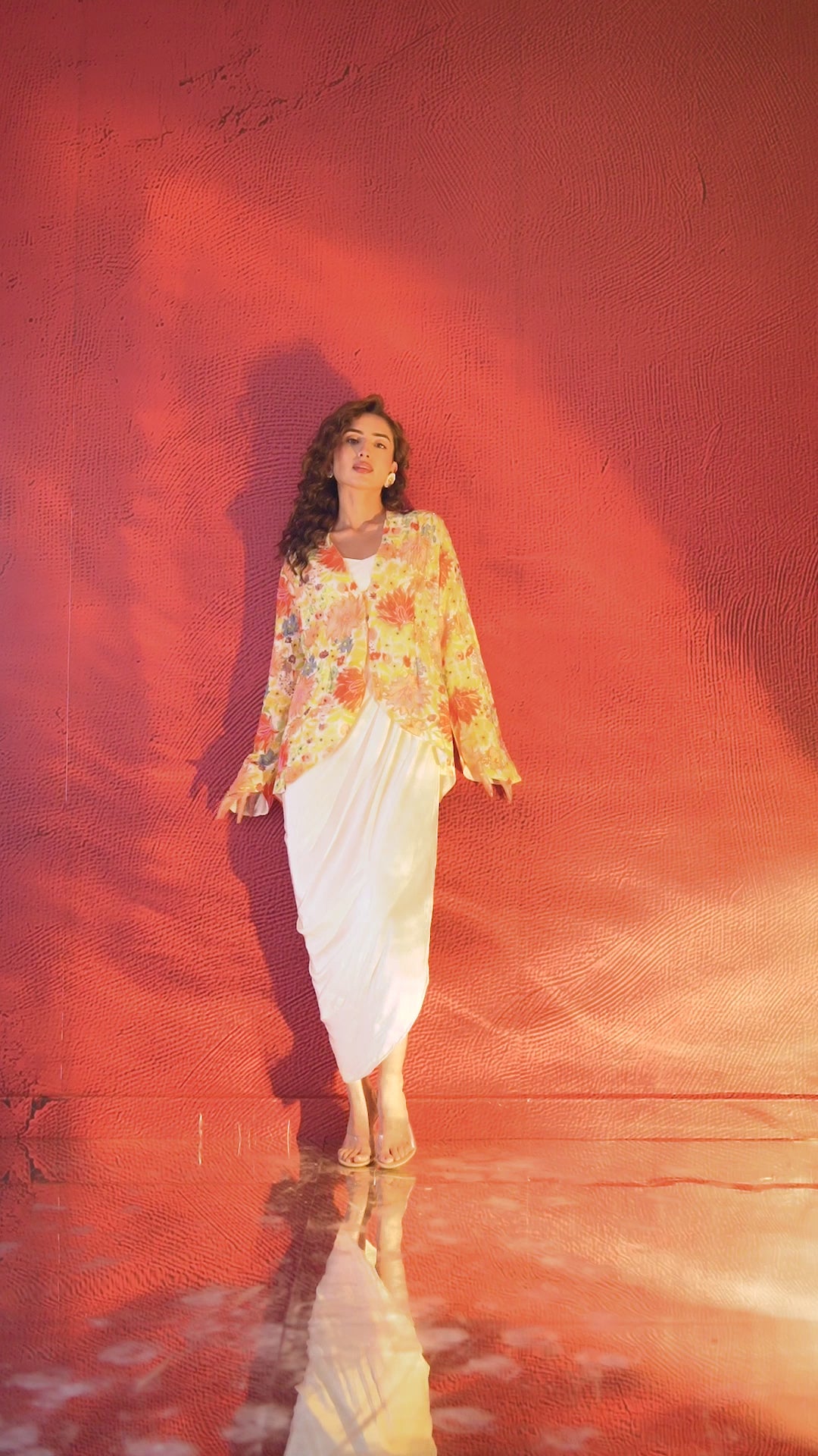 Elevate your party wardrobe with our effortlessly stylish ensemble. The yellow embellished jacket showcases intricate floral work, adding a vibrant and eye-catching detail. Paired with an ivory Italian silk gown featuring a chic side slit, this outfit exudes glamour and sophistication. Perfect for semi-formal events, it beautifully balances elegance and modern flair.