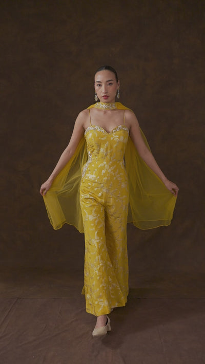 Canary Yellow Embellished Brocade Silk Jumpsuit Set