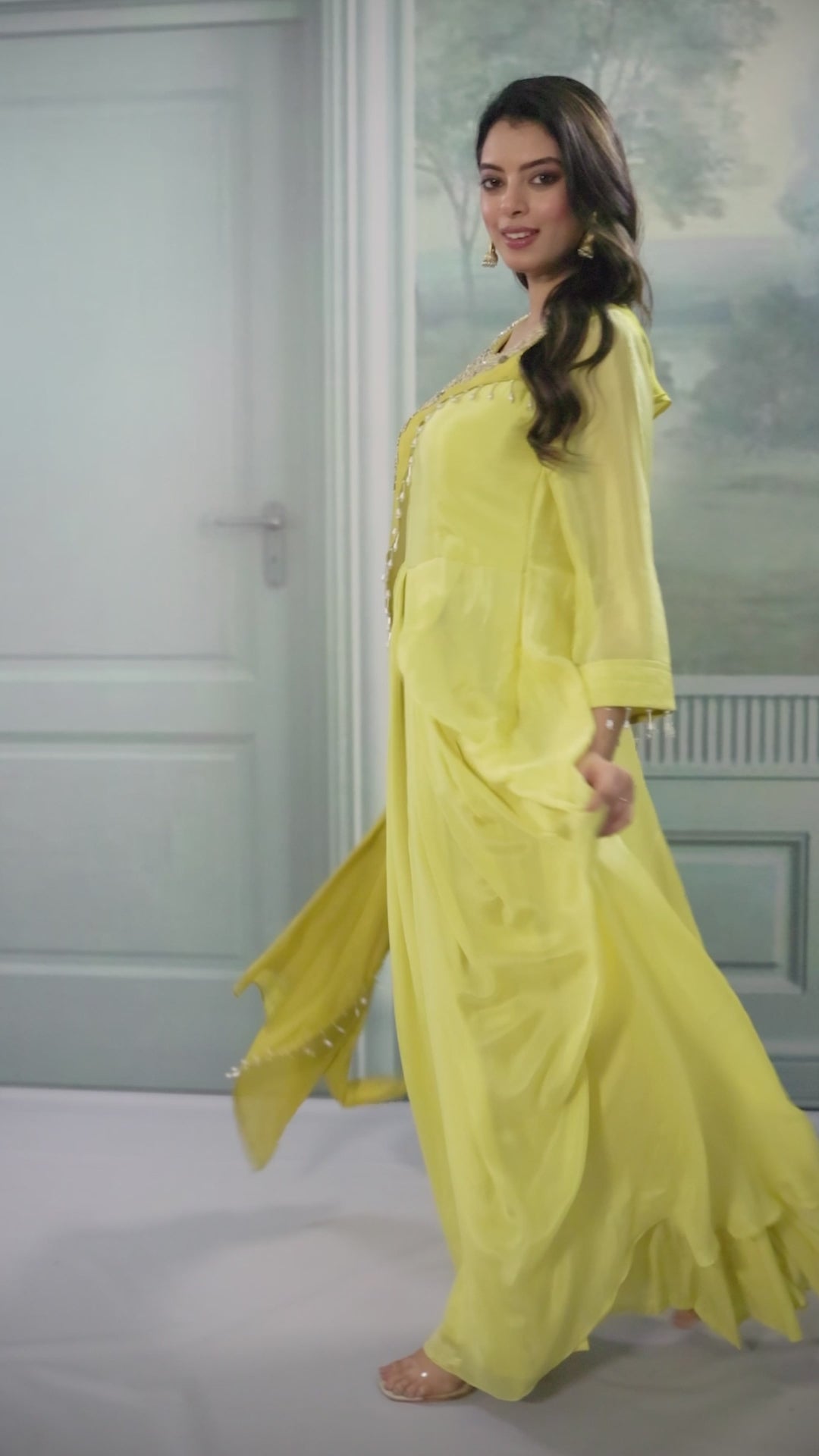 Resonates your look with style and refinement with our Yellow Embellished Chinon Silk Gown. The meticulously hand-worked of sequins, cutdana and beads work on the gown showcase exquisite craftsmanship. This ensemble radiates effortless grace. Perfect for year-round festivities.