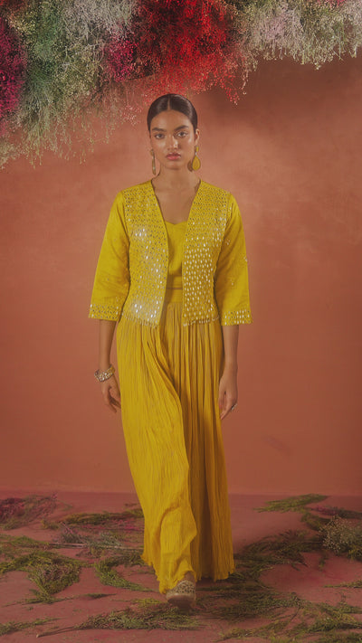 A contemporary ethnic ensemble featuring a raw silk crop top and mirror-embroidered jacket, paired with flowy, pleated georgette palazzo pants. The mirror work is intricately detailed with bead embellishments, adding a festive sparkle. The color is a warm mustard yellow, perfect for both day and evening celebrations.