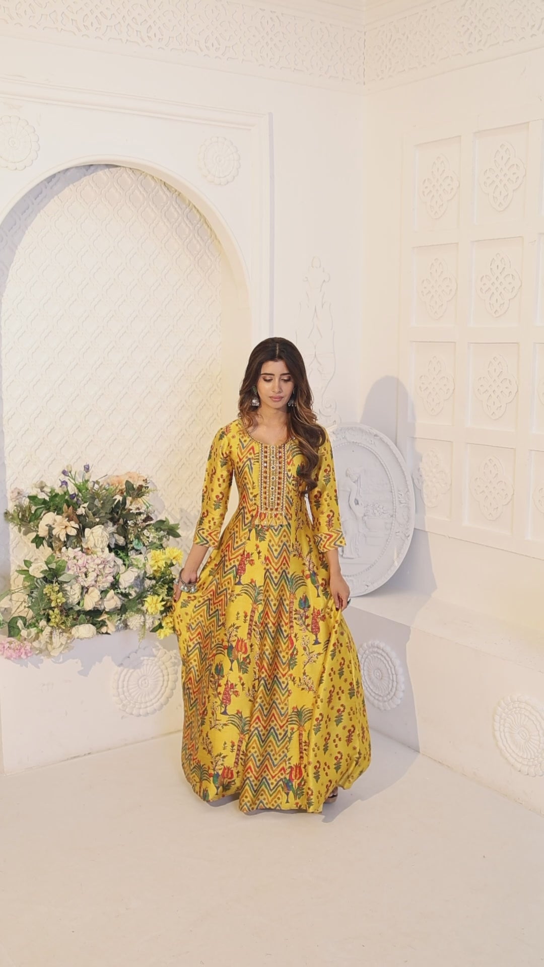 Mustard Yellow Printed Premium Silk Anarkali Gown